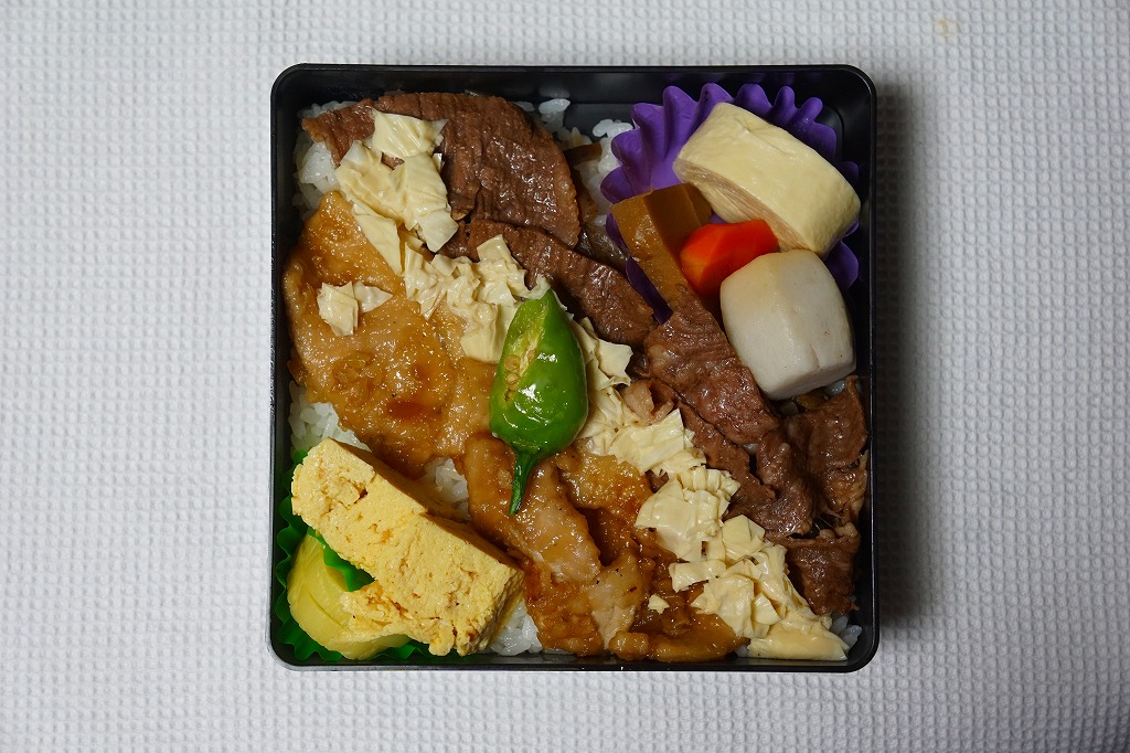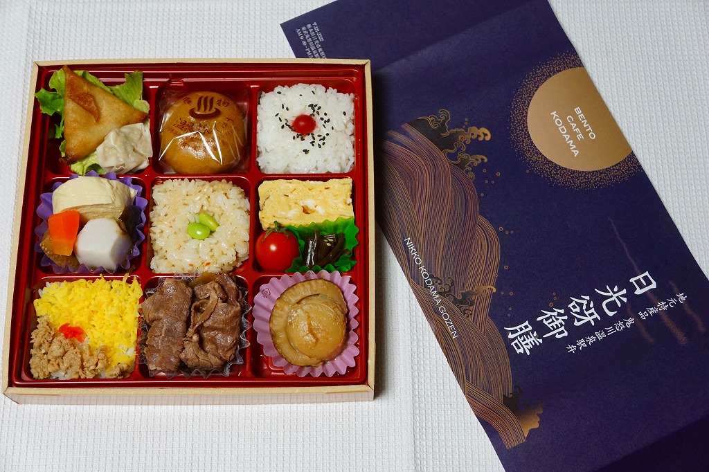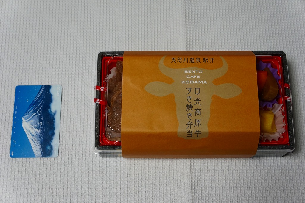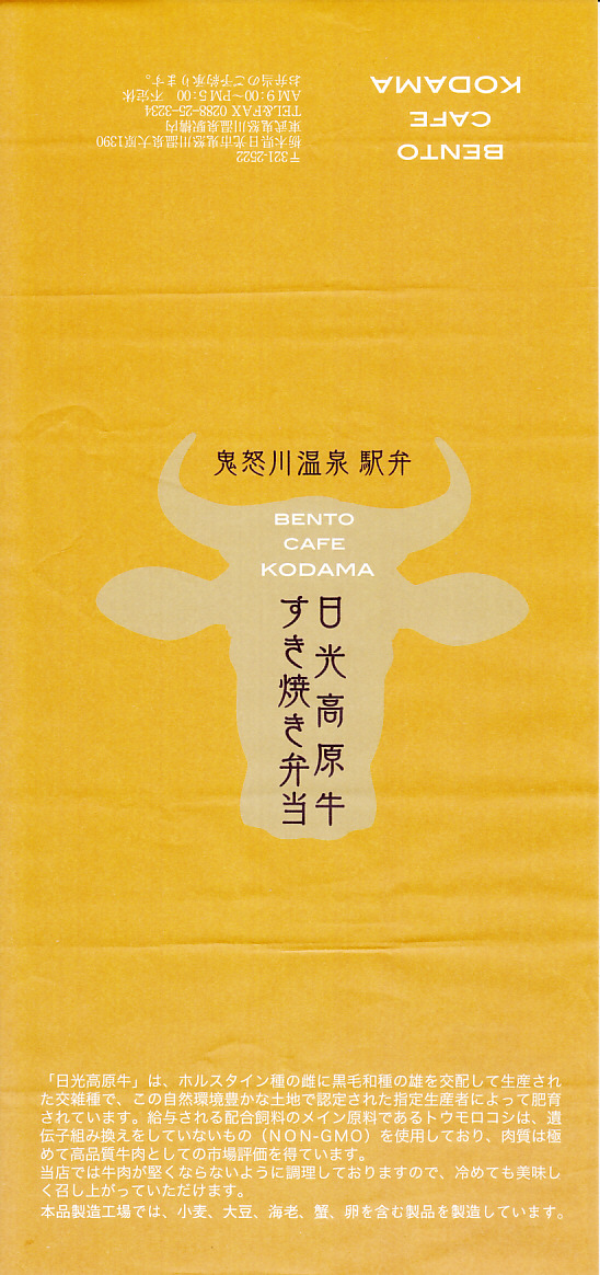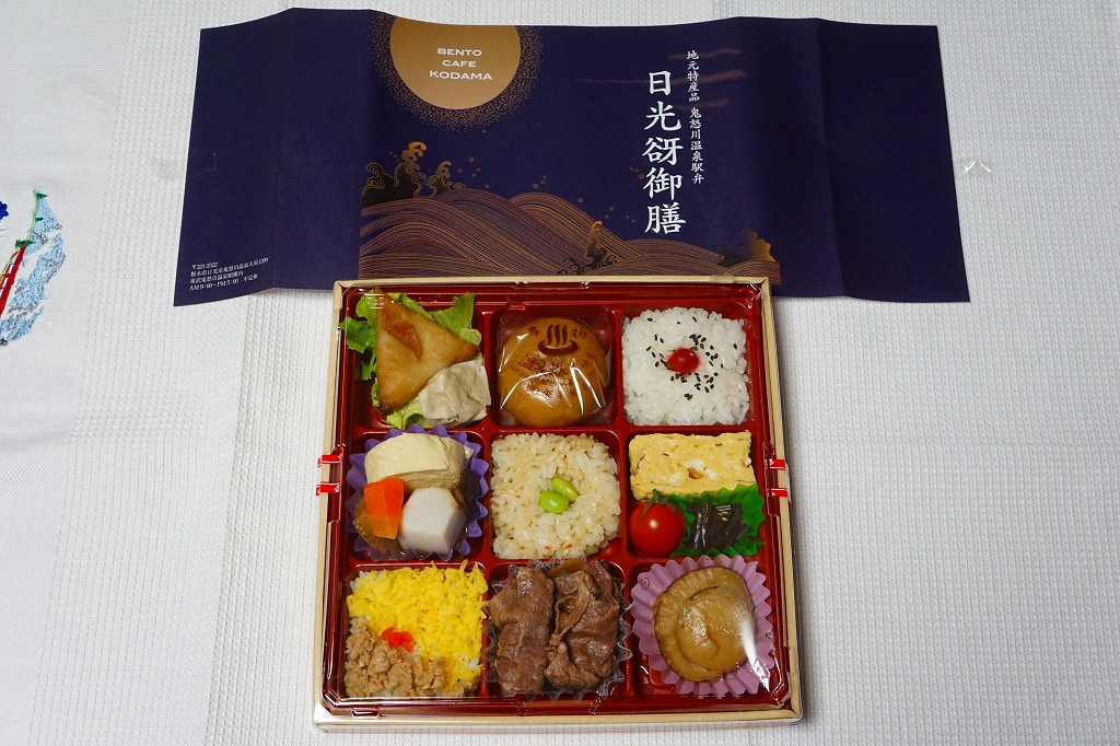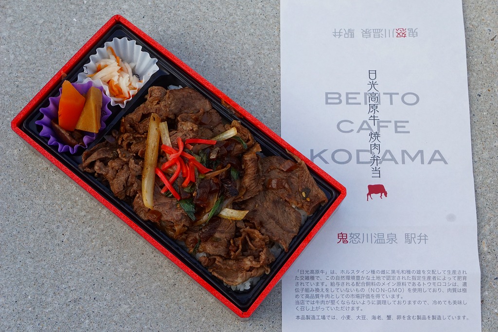 2017(平成29)年の春までに発売か。白くおしゃれな掛紙を巻かれた長方形の容器に白飯を詰め、日光高原牛の焼肉で覆い、煮物や酢の物や炒め物を添える。薄めの肉はしっかり固く、赤身の存在感またはB級感のあるお惣菜。価格は2017年の購入時で1,080円、2020年時点で1,296円、2024年時点で1,728円。