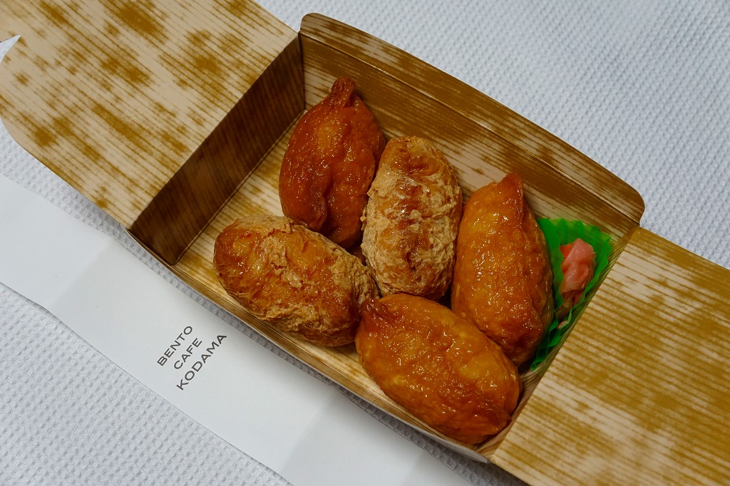鬼怒川温泉駅で下記の駅弁を売る店舗で買えた稲荷寿司。竹皮柄のボール紙に、おいなりさん5個と生姜を詰めて、カフェの名を記した紙帯を巻いていた。特に解説はないものの、やや小柄な稲荷は油揚げの風味がそれぞれ異なり、味に優れた軽食。御飯ばかりなので腹持ちもする。価格は2018年の購入時で435円、2020年時点で486円、2024年時点で648円。