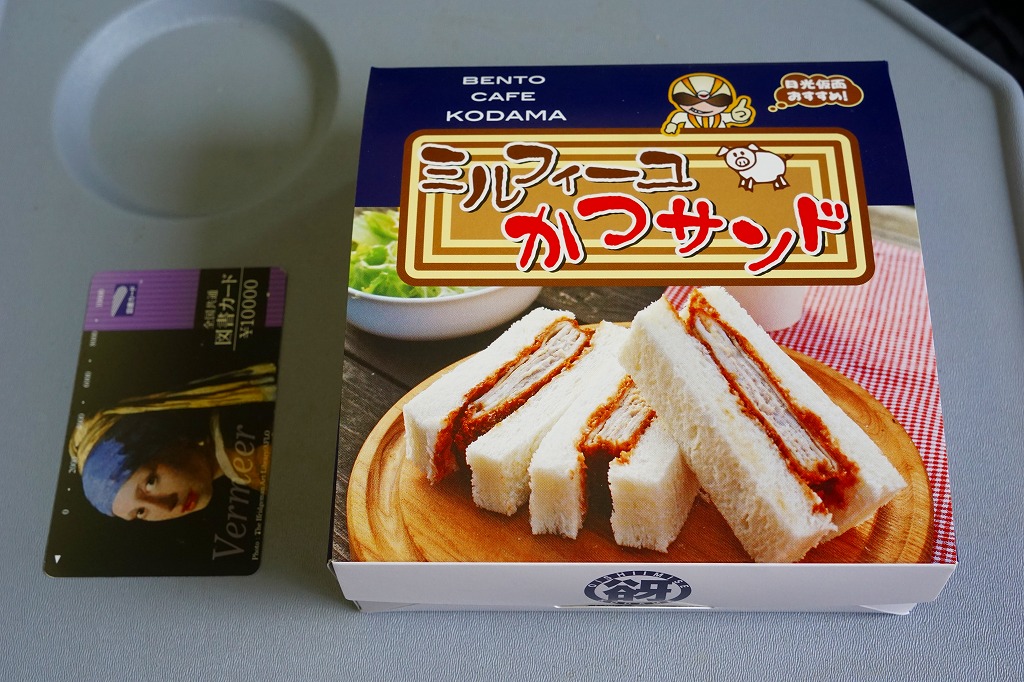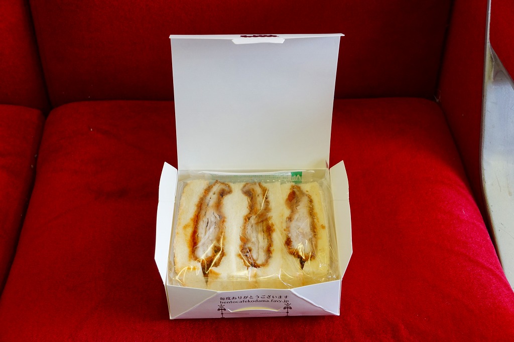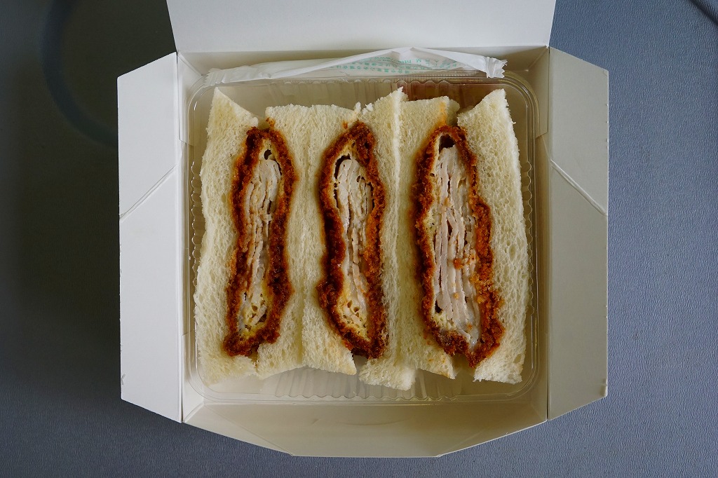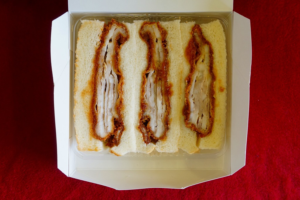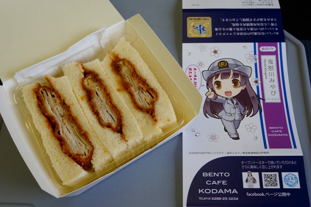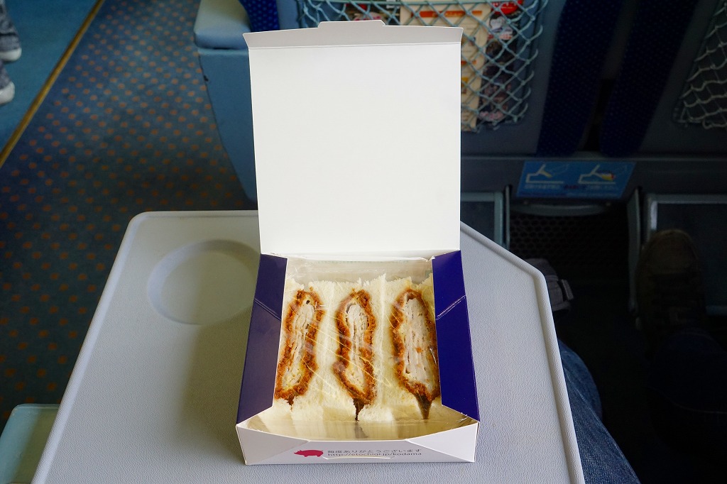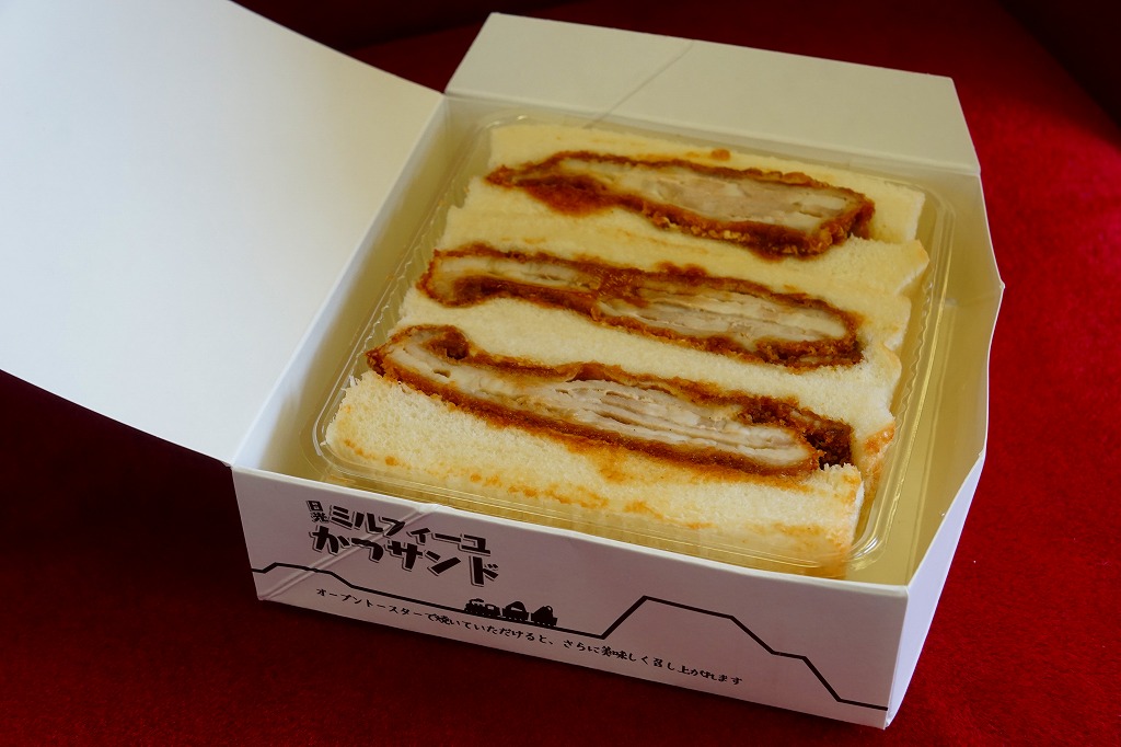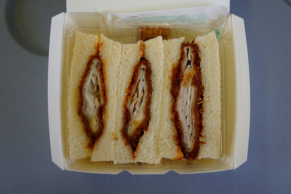 栃木県日光市産の豚肉を薄切りにして重ねて揚げたトンカツを、トーストした耳なしパンに挟んだカツサンドを3切れ、透明なプラ製トレーに詰めた後に紙箱に収める。山梨県の小淵沢駅で人気になった同種の駅弁は脂とタレの味がきつかったが、こちらは肉の量も味も軽め。以下のとおり2015年に3箱まとめて食べても胃にもたれなかった。価格は2014年の発売時で550円、2015年時点で600円、2017年の購入時で615円、2019年時点で650円、2020年時点で680円、2023年時点で702円、2024年時点で918円。