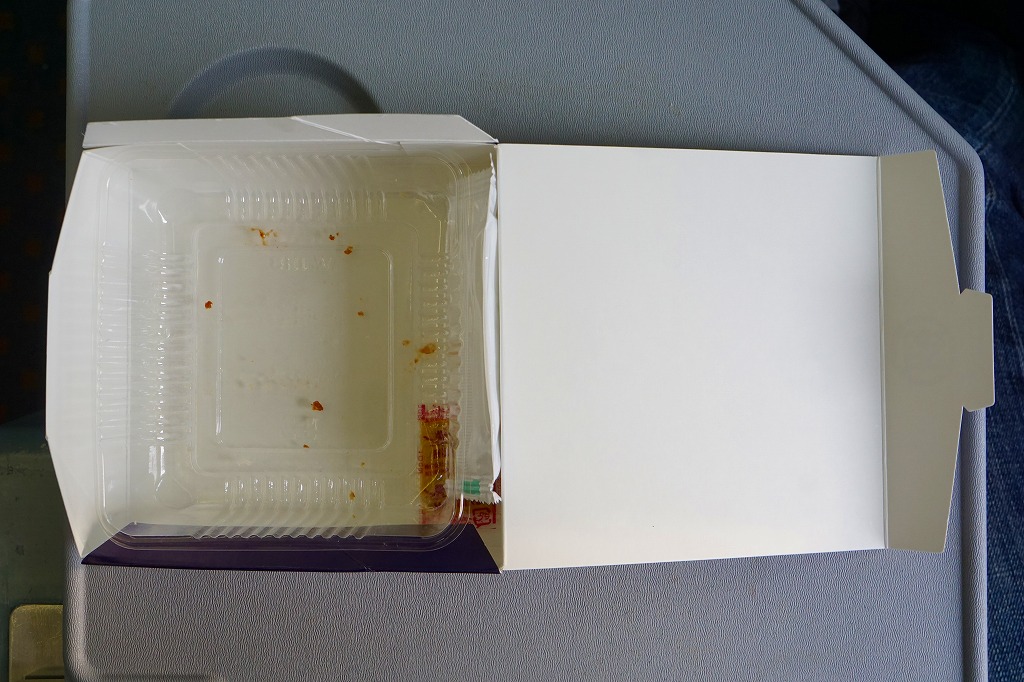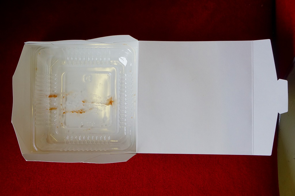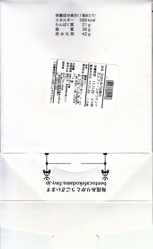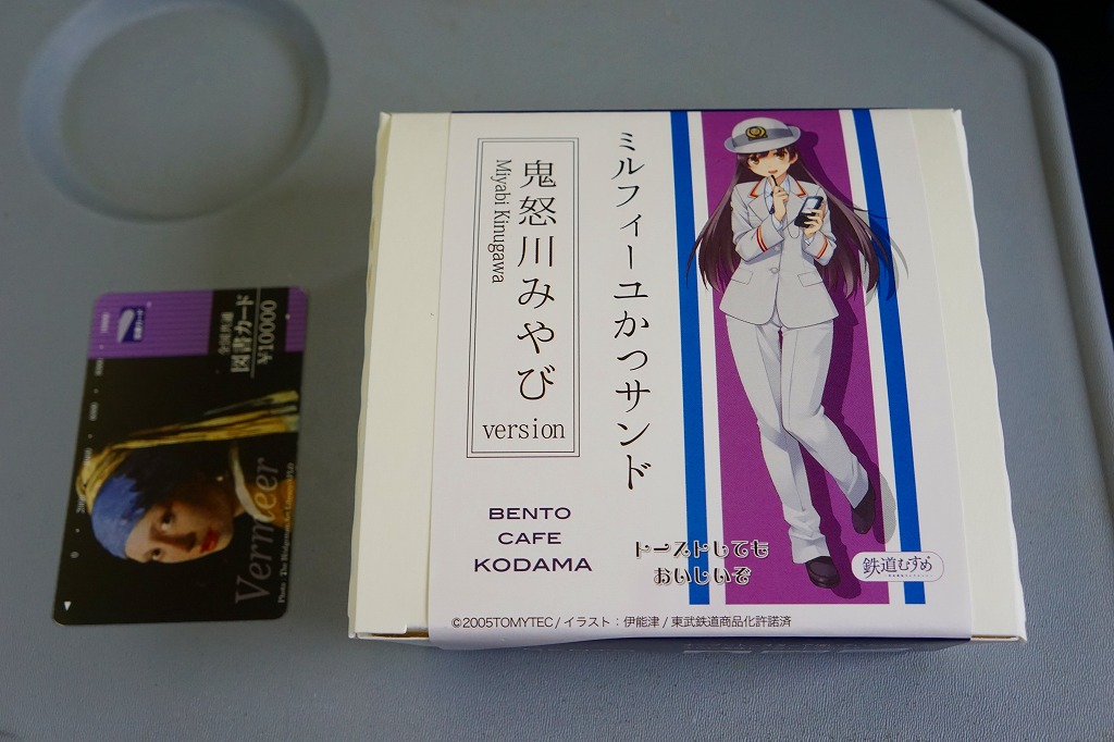 2015(平成27)年5月16日に購入した、鬼怒川温泉駅弁の紙箱。上記の駅弁「ミルフィーユかつサンド」と同じもので、同日に購入した3箱分すべて、容器の構造や中身や値段は同じ。紙箱が真っ白になり、トミーテックの東武鉄道向けキャラクター「鬼怒川みやび」を描いた掛紙を巻いていた。