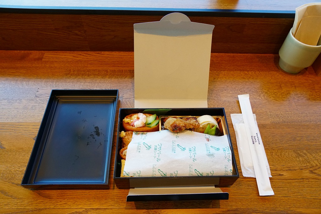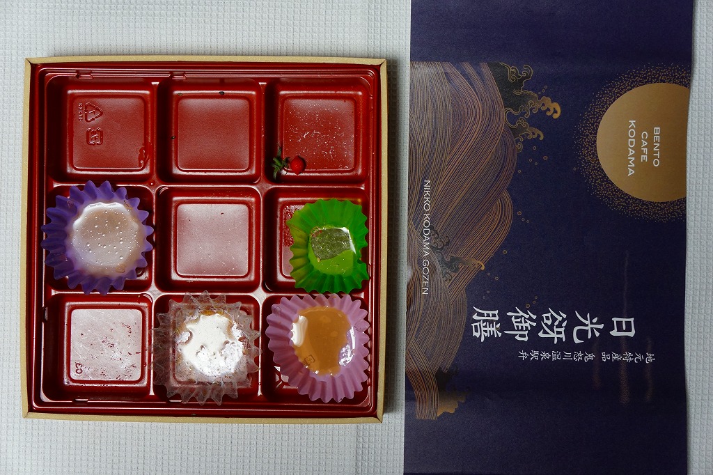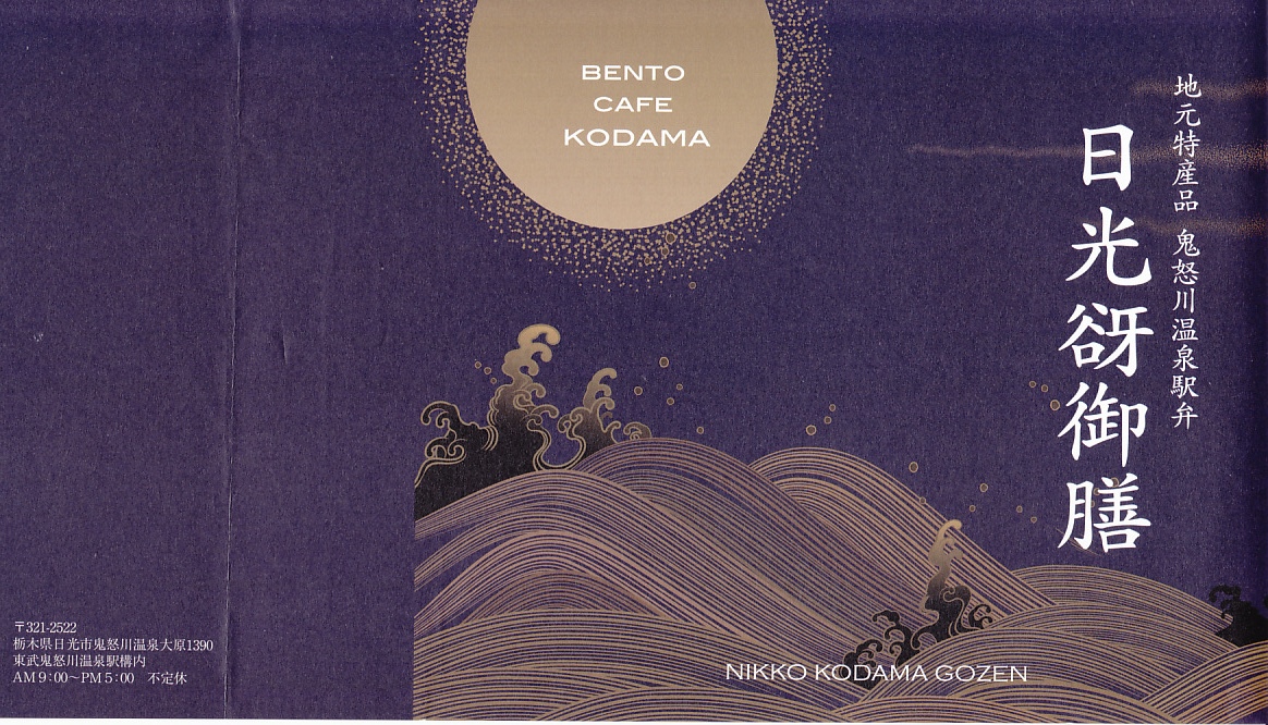 2017(平成29)年の春までに発売か。「谺」には樹木の精霊、木魂、やまびこ、反響という意味があるそうで、この駅弁を売るカフェや調製元の店舗の名前に使われている。美しい掛紙に包まれた正方形のプラ容器の9区画に、日の丸、五目、鶏親子で3種の御飯、牛肉煮、ホタテ、湯波やニンジンやサトイモなどの煮物、玉子焼とミニトマトときゃらぶき、焼売と春巻き、温泉饅頭1個を詰めた、なんでもまるごと弁当。価格は2017年の購入時で1,295円、2020年時点で1,458円、2024年時点で1,890円。