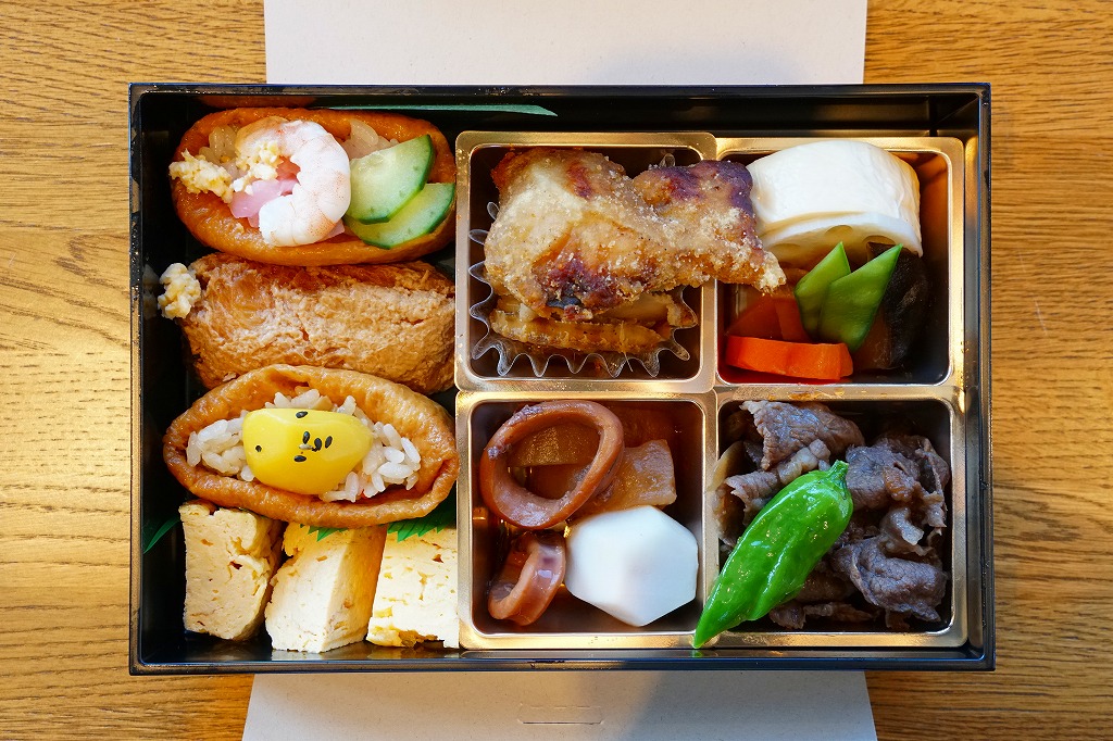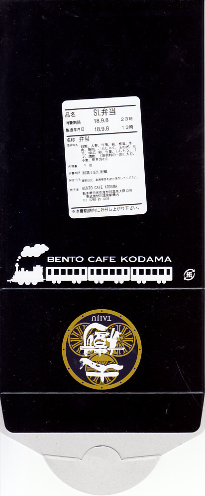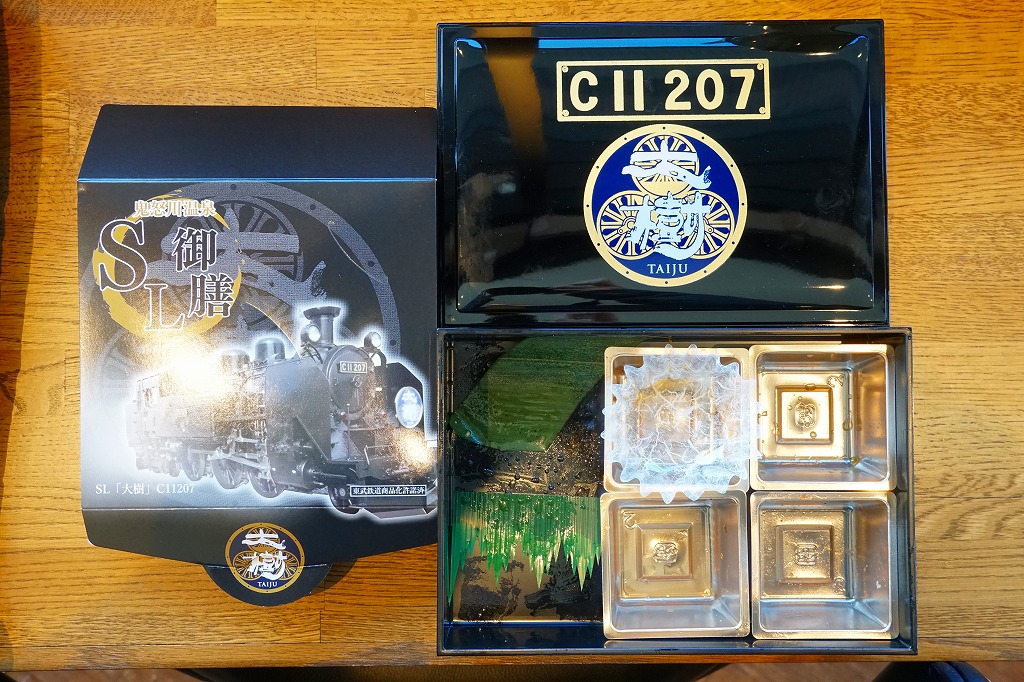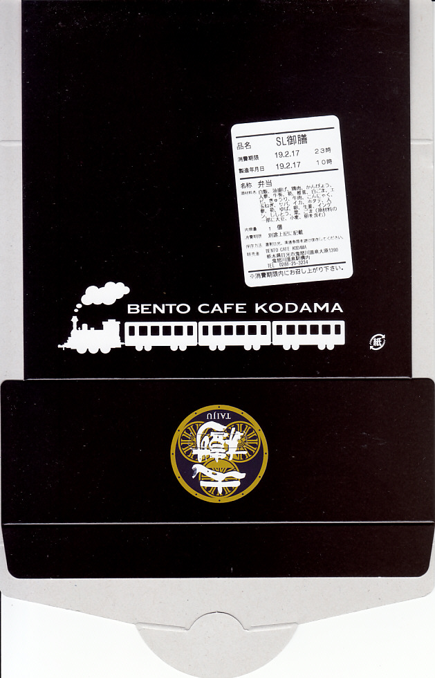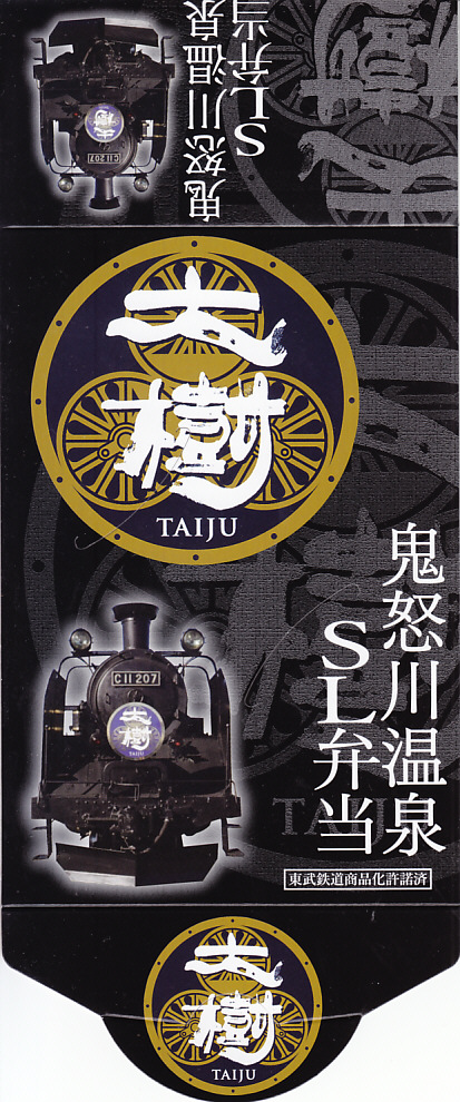 2017(平成29)年8月の東武鉄道のSL列車「SL大樹」の運行開始に合わせて発売か。SL大樹の蒸気機関車とロゴマークでデザインしたボール紙の掛紙を取ると、SL大樹のナンバープレートとヘッドマークを印刷した真っ黒なプラ容器が現れる。中身は3種のおいなりさんと玉子焼、加えて金色のトレーを4つ入れ、湯波などの煮物、牛肉煮、揚げ魚とホタテ、イカやダイコンなどの煮物という豪華版。価格は2019年の購入時で1,620円、2020年時点で1,758円、2024年時点で2,268円。