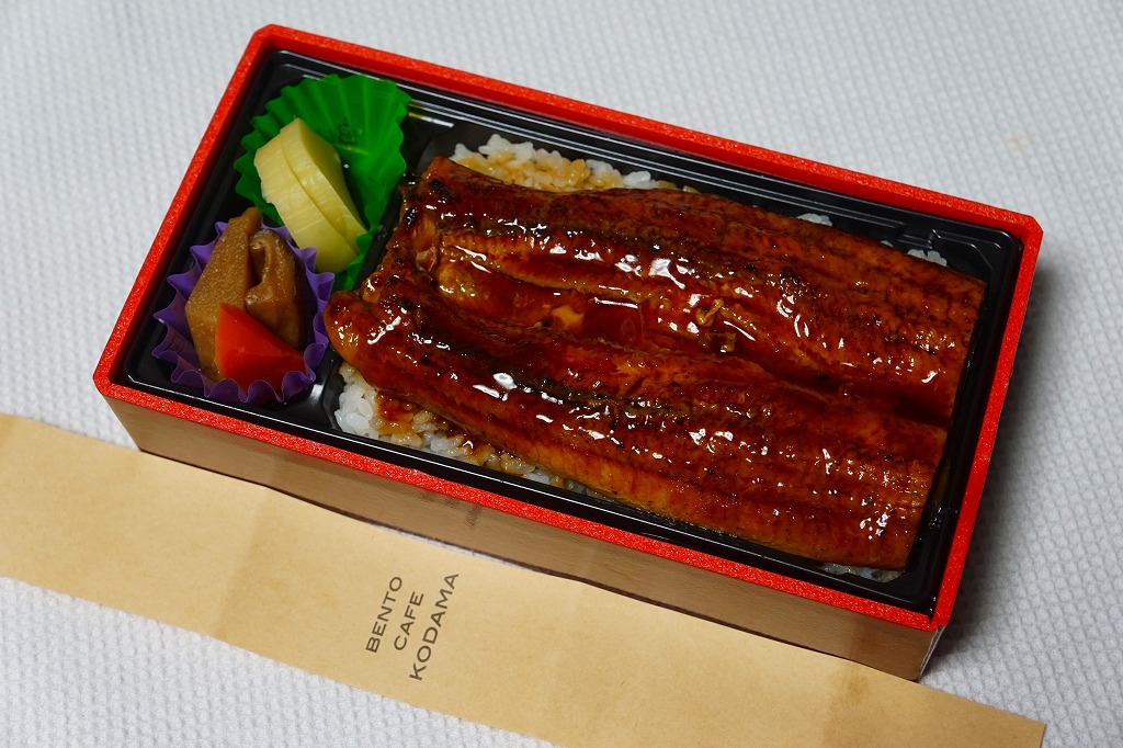鬼怒川温泉駅で下記の駅弁を売る店舗で買えた鰻重。2017(平成29)年11月の訪問時にも売られていたが、今回は容器にカフェの名を記した紙帯を巻き、少し駅弁らしく見えたので買ってみた。白飯にウナギ蒲焼きを載せ、ニンジンなどの煮物とたくあんを添える、ただの鰻重。カフェのコンセプトや鬼怒川温泉との関連を感じられない。ウナギは特に個性のない、スーパーで買える真空パック品のようなもの。価格は2018年の購入時で1,295円、2020年時点で1,458円。2021年までの販売か。