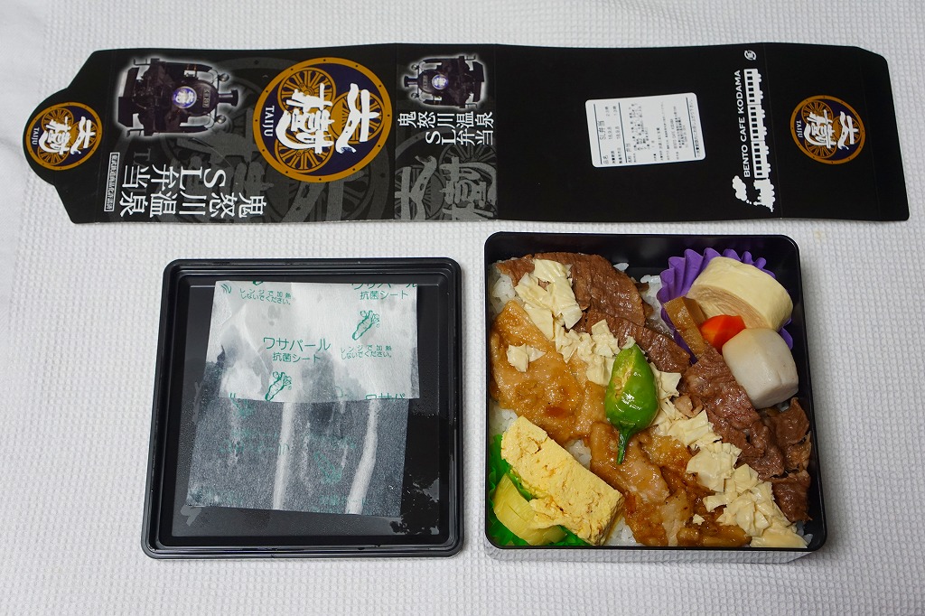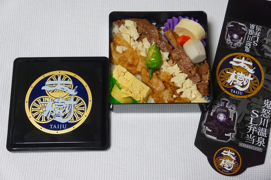 2017(平成29)年8月の東武鉄道のSL列車「SL大樹」の運行開始に合わせて発売か。SL大樹の蒸気機関車とロゴマークでデザインしたボール紙の掛紙を取ると、SL大樹のヘッドマークを印刷した真っ黒なプラ容器が現れる。中身は御飯を牛焼肉と豚肉揚と湯波のストライプで覆い、玉子焼とサトイモやニンジンなどの煮物と湯波巻きとタクアンを添えるもの。外観と名前が似るここの駅弁「鬼怒川温泉SL御膳」とはまるで異なる、力強い重量級の肉丼。価格は2018年の購入時で1,400円、2020年時点で1,512円、2024年時点で1,998円。