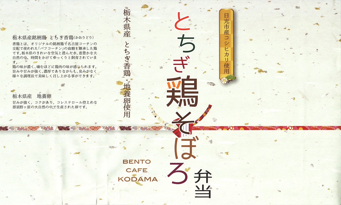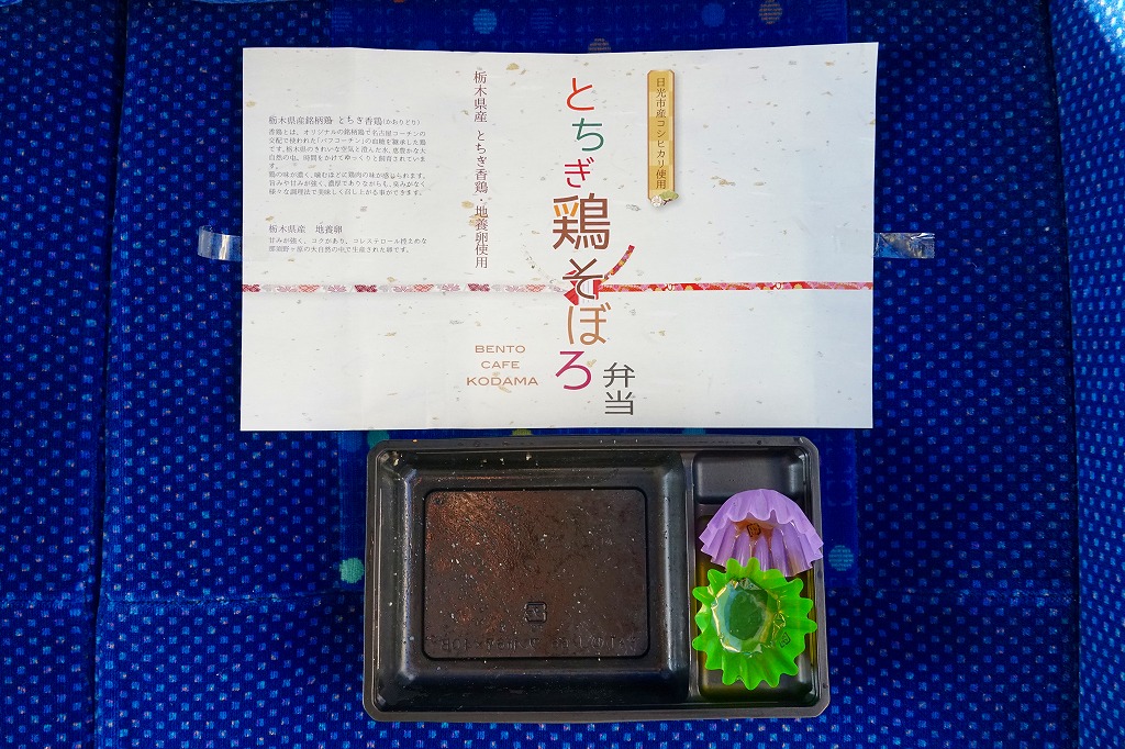 2018(平成30)年5月1日に発売。白飯を鶏そぼろと炒り卵で覆い、シイタケ煮で仕切って鶏つくねと紅生姜を置き、煮物と漬物を添える。内容は普通の鶏飯駅弁も、栃木県産銘柄鶏の「とちぎ香鶏」を使うという鶏肉は、水気が豊かなこともあり味付けも食感も柔らかめで、普通の駅弁とはひと味違うぬくもりがあった。1年間ほどの販売だった可能性がある。
