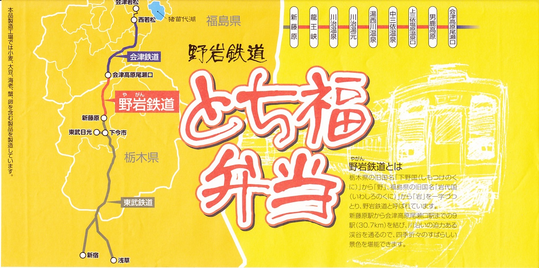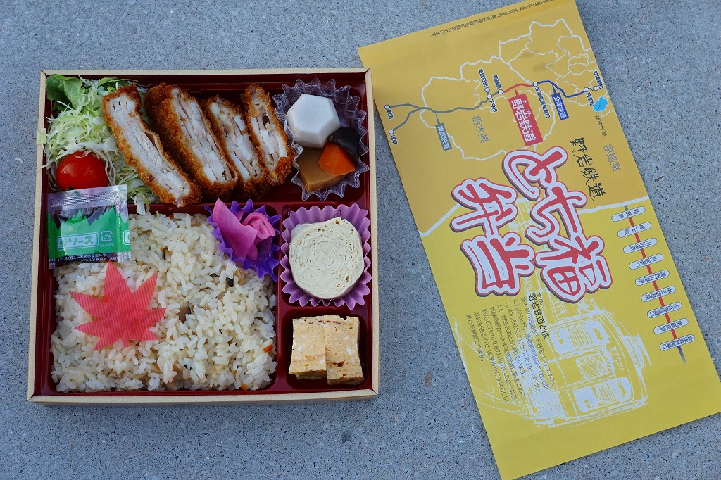 2012(平成24)年3月に、野岩鉄道の団体客向け予約専用弁当として発売。2015(平成27)年頃から、野岩鉄道でなく東武鉄道の鬼怒川温泉駅のカフェで買えるようになった模様。掛紙には野岩鉄道の位置図と路線図と解説文が描かれる。中身は五目飯にミルフィーユかつ4切れ、湯波と玉子焼、キャベツとミニトマトと煮物など。調製元の鬼怒川温泉駅弁と同じようなものが入っていた。野岩鉄道のイベントで売られることがある模様。価格は2017年の購入時で1,080円、2020年時点で1,296円、2024年時点で1,728円。