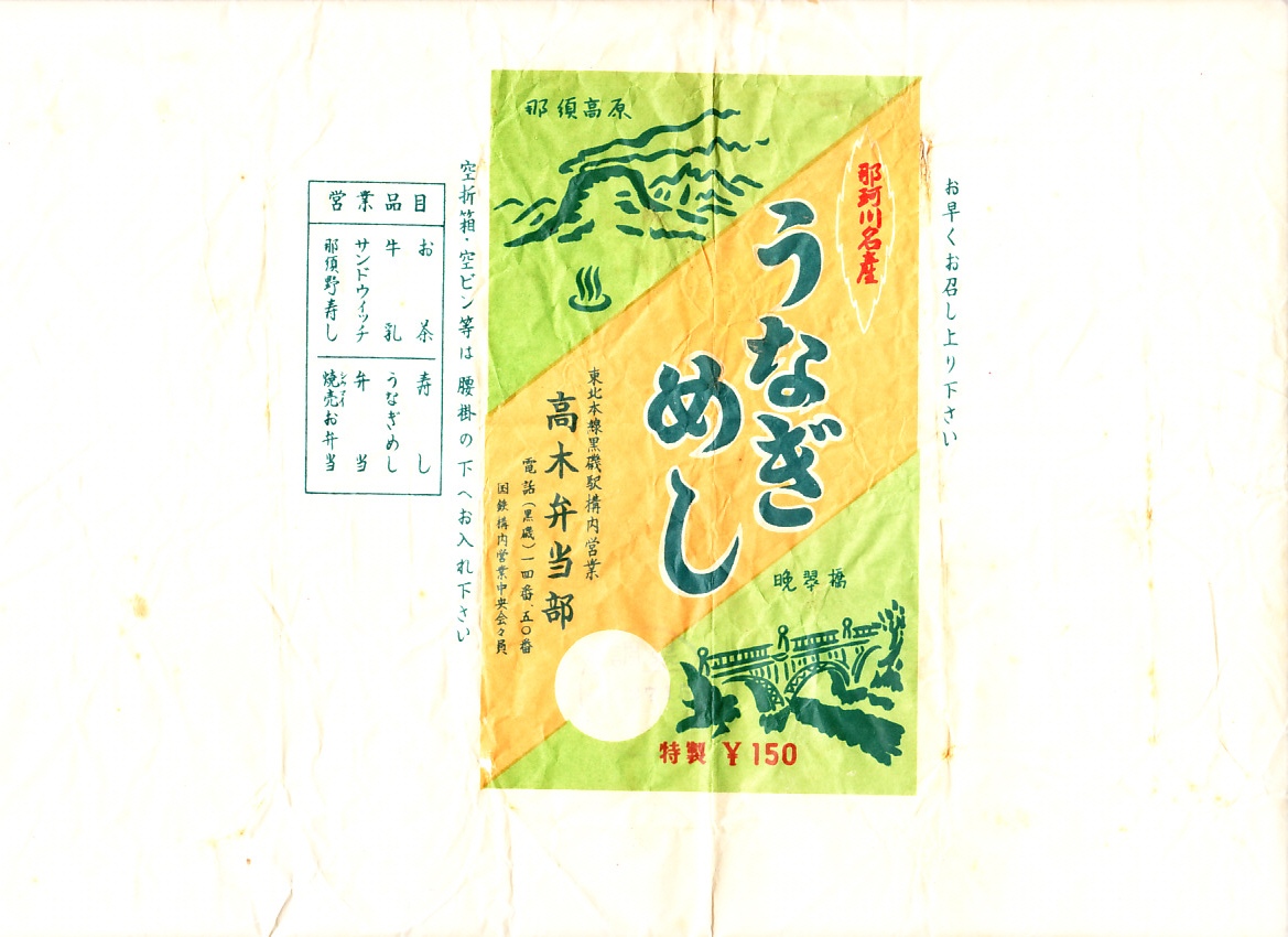 1960年代の調製と思われる、昔の黒磯駅弁の掛紙。那須高原と晩翠橋を描く。「那須川名産」をうたったり、「営業品目」として「お茶」「牛乳」「サンドウイッチ」「那須野寿し」「寿し」「うなぎめし」「弁当」「焼売(シウマイ)お弁当」という商品一覧を掲載した。