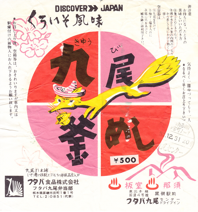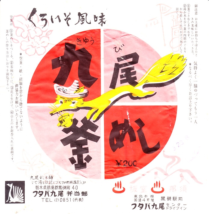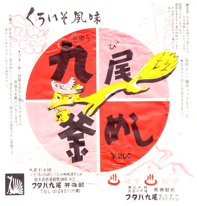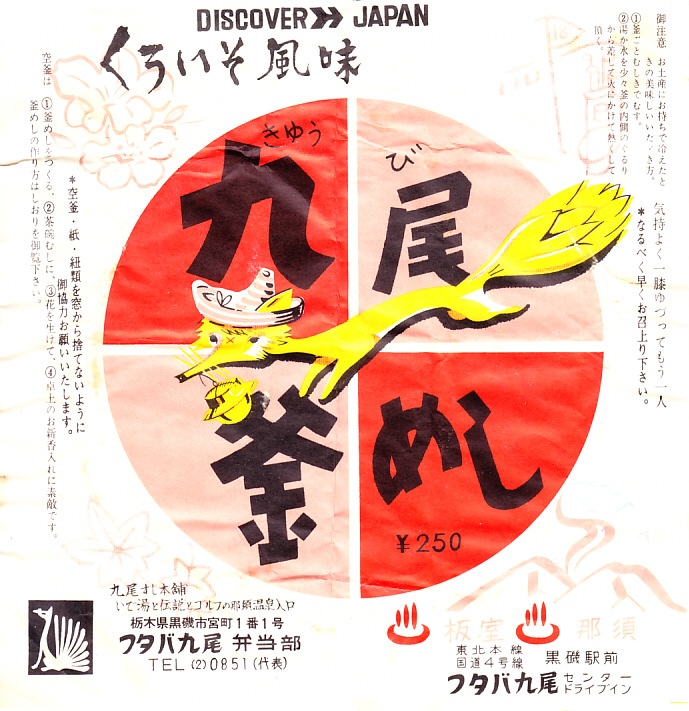 価格から1960年代後半のものと思われる、昔の黒磯駅弁の掛紙。調製元の名は「栃食九尾センター」で、黒磯駅前に大きな調製所があった。この頃には栃木食糧品工業から栃食改めフタバ食品へ、1963年に社名を変えていたはず。「フタバ九尾センター」になったのは1970年代か。