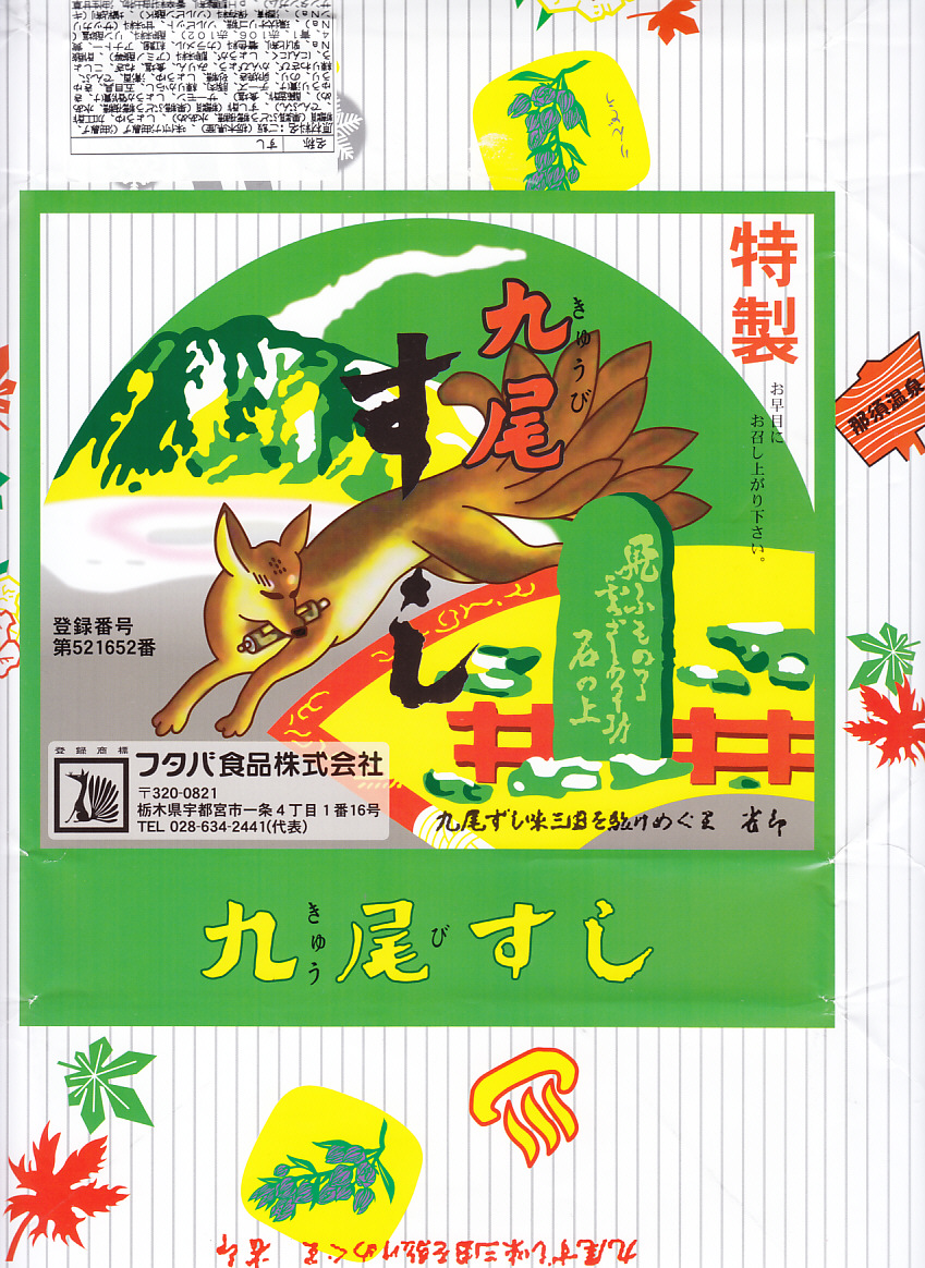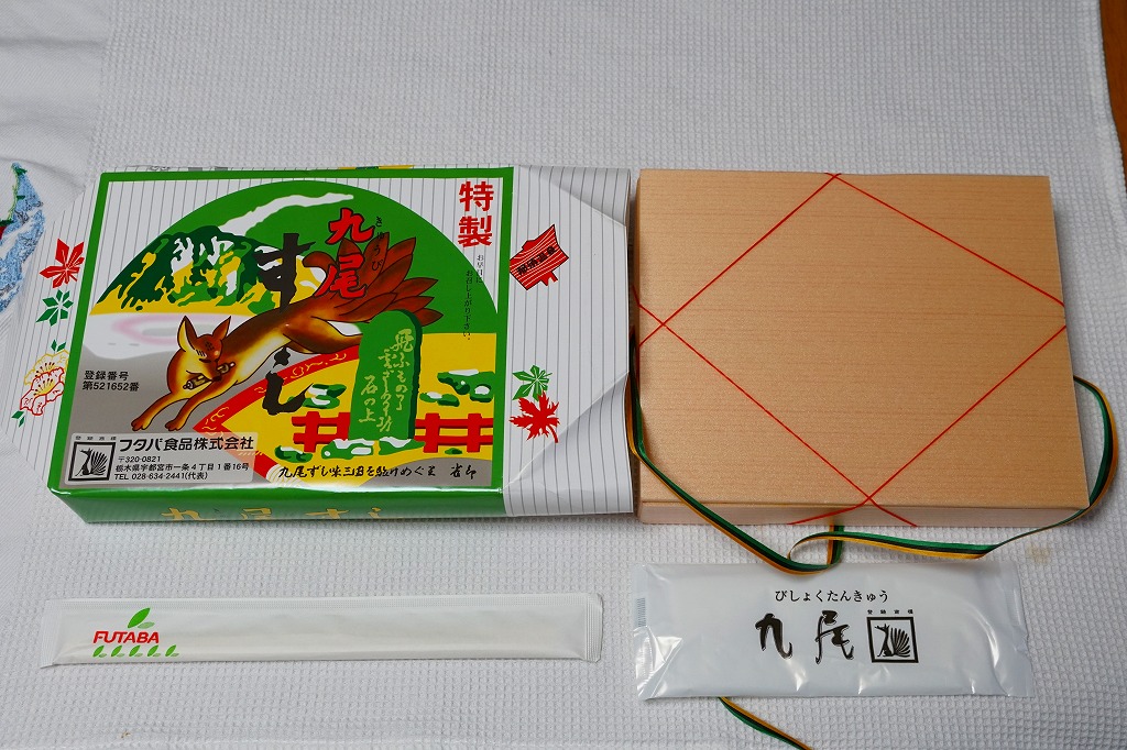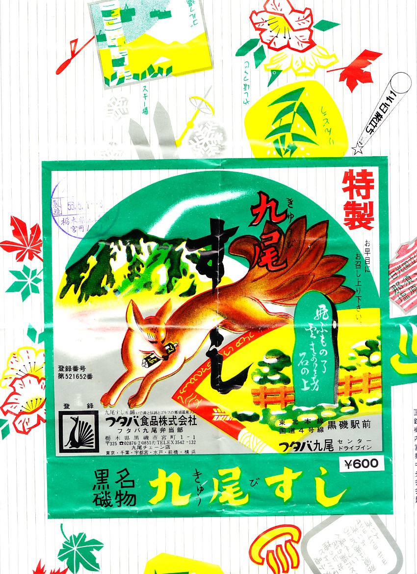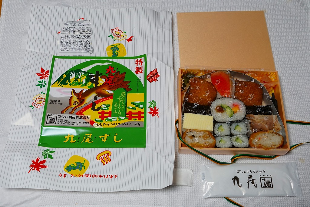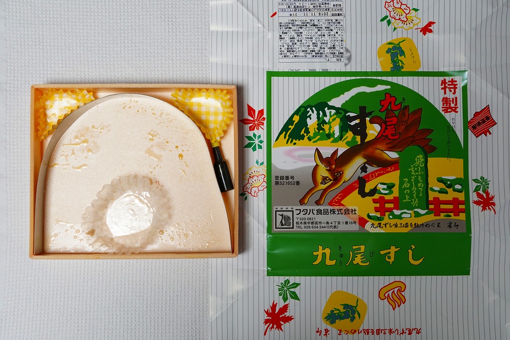 昭和30年代までに黒磯駅で発売された、かつての名物駅弁「九尾すし」の復刻版。2005(平成17)年11月限りですべての黒磯駅弁が失われた後、2012(平成24)年の秋に当時の駅弁屋であるフタバ食品が運営する、東北自動車道下り線の上河内サービスエリアで復活した。2016(平成28)年の秋までに土日曜日に限り、JR宇都宮駅の駅ビル「PASEO」の1階にある店舗「縁(えにし)」で買えるようになり、2020(令和2)年の同店の閉店で2階の土産物店「とちびより」へ移動した。