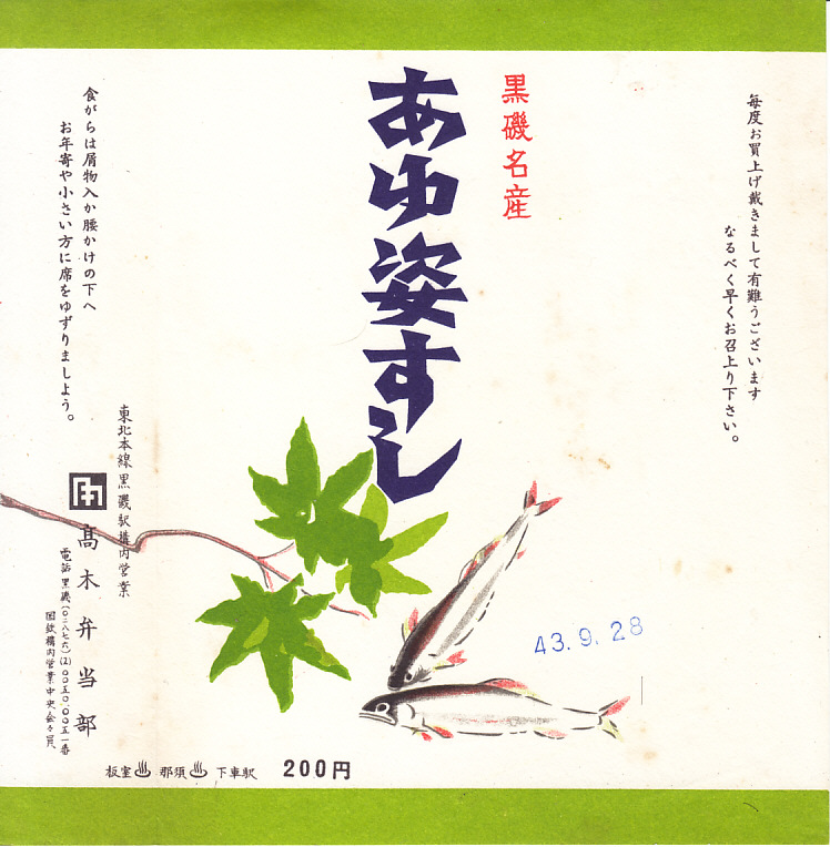 1968(昭和43)年9月28日の調製と思われる、昔の黒磯駅弁の掛紙。絵柄は上記の「黒磯名産あゆ姿すし」と同じ。