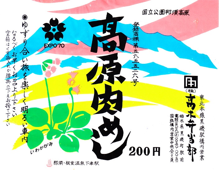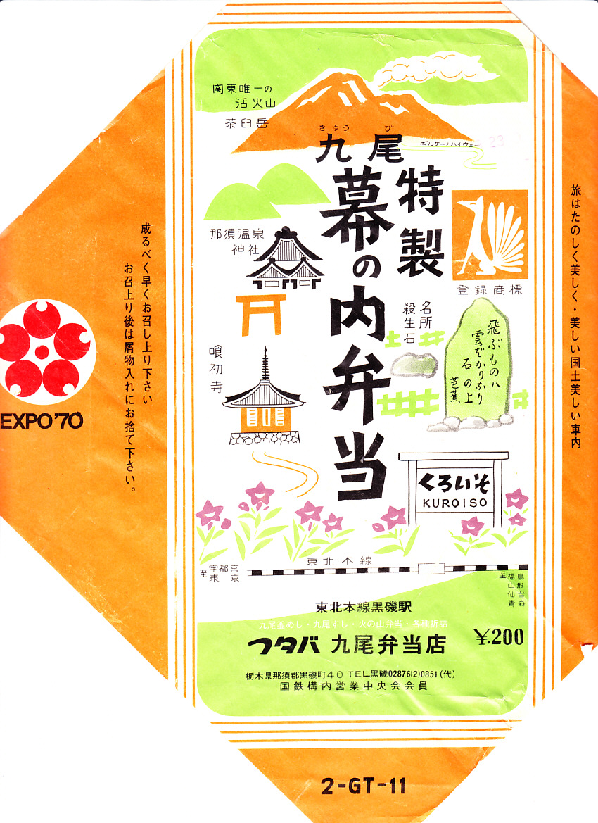 1970年頃のものと思われる、昔の黒磯駅弁の掛紙。全国共通の万博マークがあり、黒磯駅から茶臼岳に至る間の観光地をいろいろ記す。