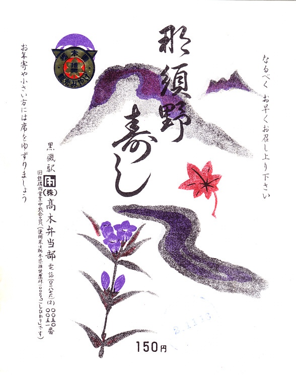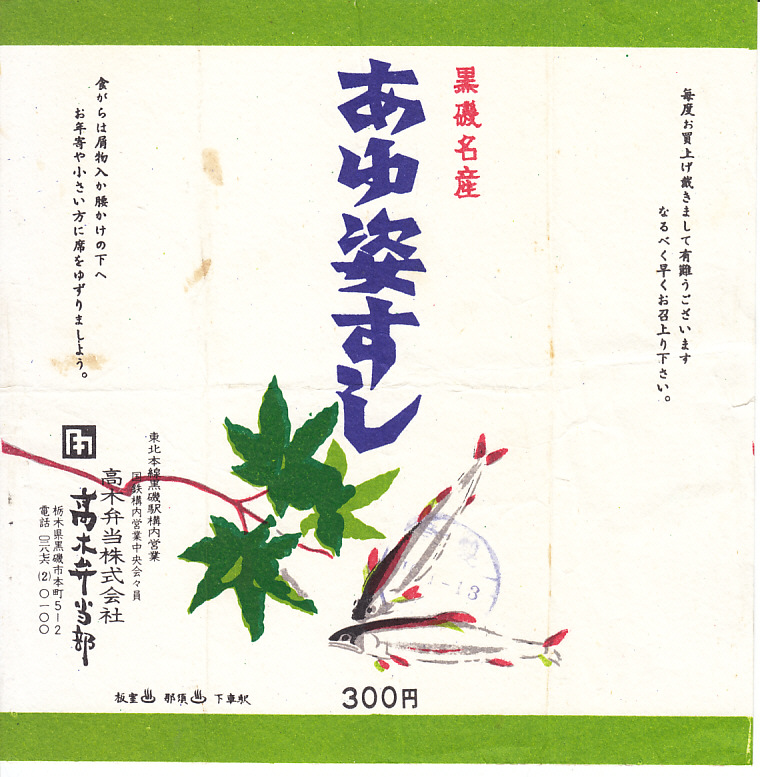 昭和40年代、1970年前後のものと思われる、昔の黒磯駅弁の掛紙。黒磯の電話に市内局番が付いた、1968(昭和43)年頃以降のものか。アユの駅弁、押寿司や姿寿司の駅弁は、第二次大戦前から昭和時代まで、本州や九州の各地で人気だった。