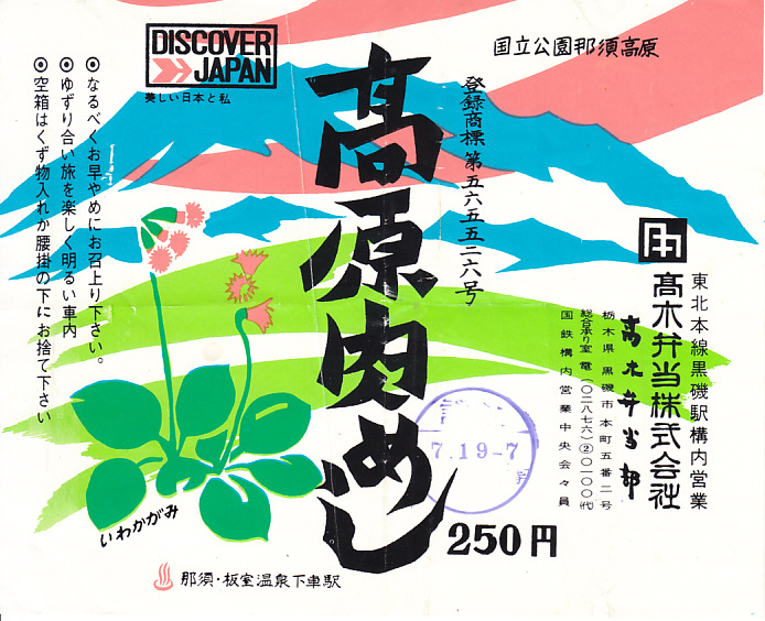 1970(昭和45)年8月15日の調製と思われる、昔の黒磯駅弁の掛紙。絵柄は上記や下記のものと変わらない。同年10月からの国鉄の観光キャンペーン「ディスカバー・ジャパン」のロゴが、すでに付いている。
