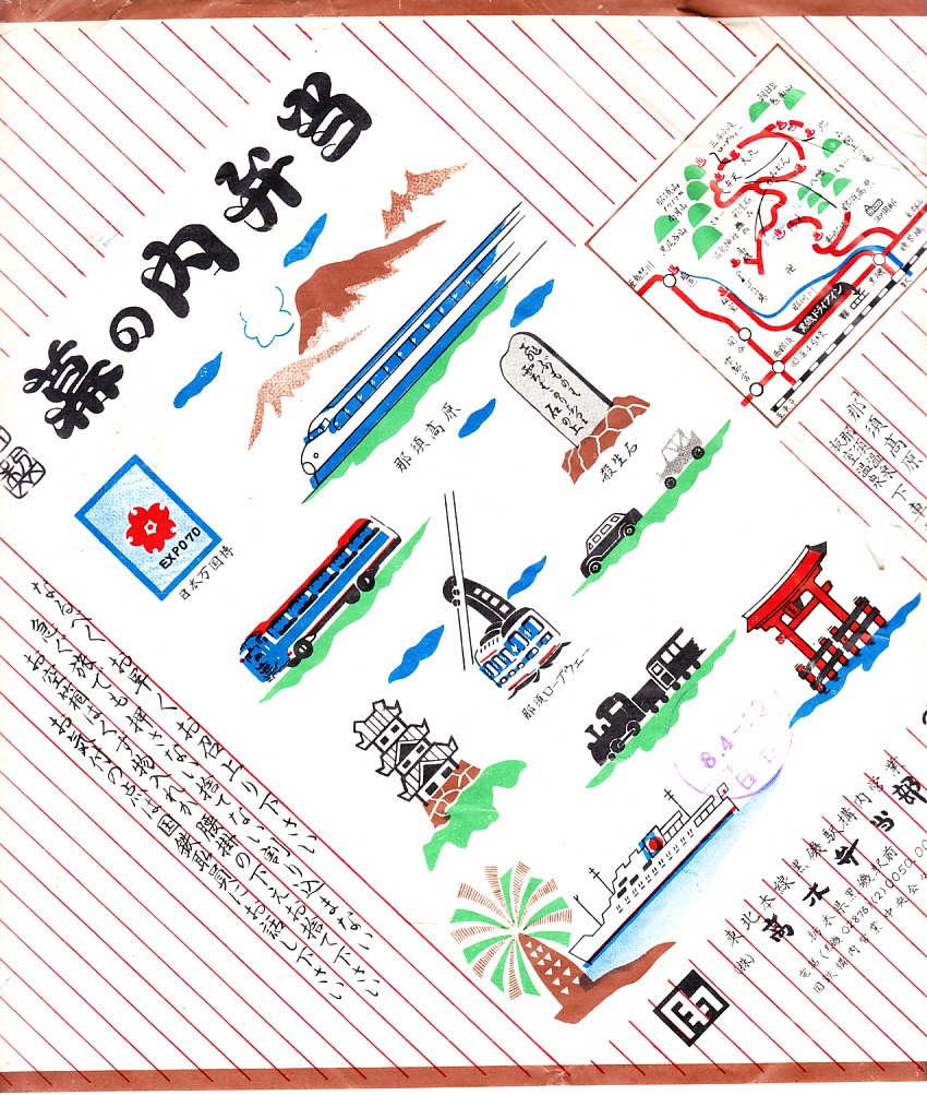 1970年頃の調製と思われる、昔の黒磯駅弁の掛紙。掛紙に描いた様々な絵柄のうち、那須ロープウェーと殺生石と国鉄バスなどの自動車は地元のものだろうが、あとは黒磯や那須で見られないものばかり。お手製の万博マークにちなみ、新幹線や大阪城や、別府か宮崎へ行くカーフェリーや厳島神社でも描いたのだろうか。