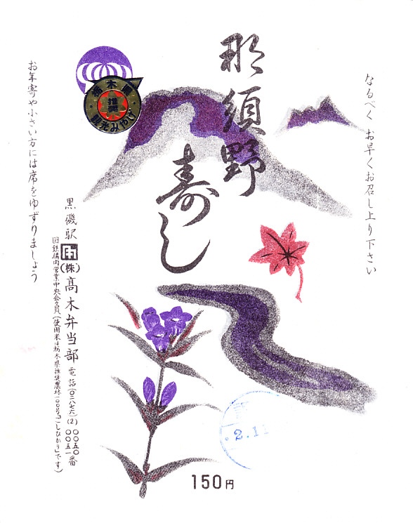 150円の価格から1967年頃の、2月11日16時の調製と思われる、昔の黒磯駅弁の掛紙。絵柄は下記のものと変わらないが、左上におそらく明治百年のロゴマークが加わり、これを少し隠すように栃木県観光みやげのシールを貼る。同じ日時の掛紙を2枚入手。