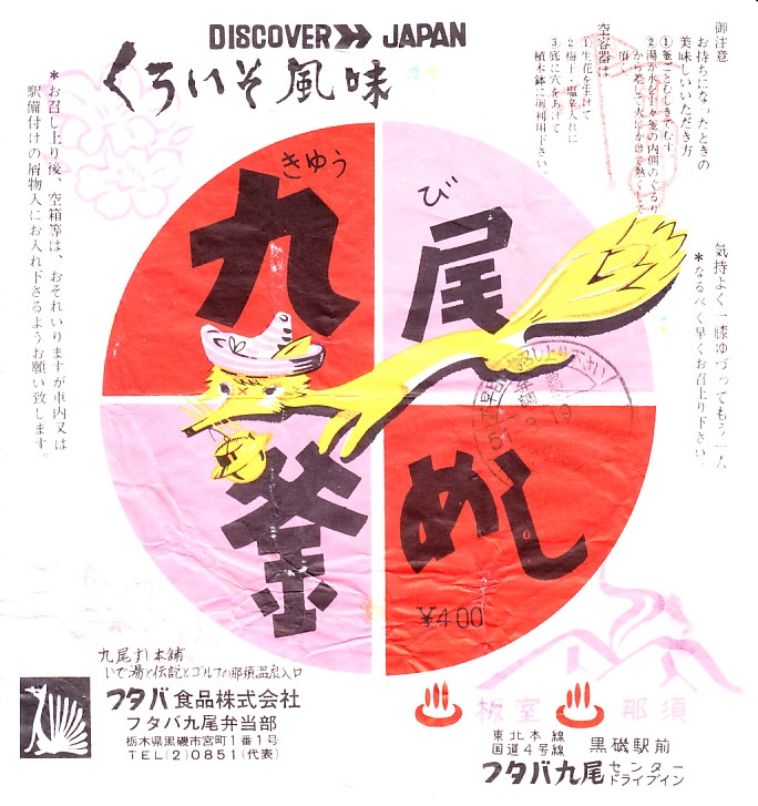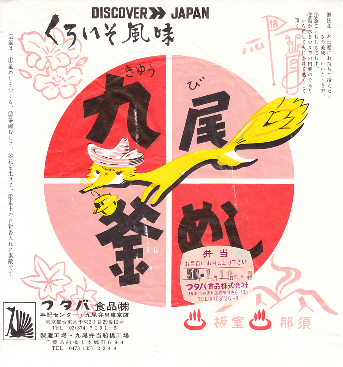 1975(昭和50)年1月10日の調製と思われる、昔の黒磯駅弁の掛紙。と思ったら、調製ラベルには神奈川県横浜市の、掛紙には東京都台東区と千葉県船橋市の住所が記される。調製元のフタバ食品は冷菓や洋菓子で東日本の各地と名古屋や大阪に支店や営業所を置く食品メーカーであるが、当時は首都圏でも黒磯駅の駅弁と同じ弁当を販売したことがうかがえる。掛紙の絵柄は、黒磯駅の駅弁と同じ。国鉄の旅行キャンペーン「DISCOVER→JAPAN」のロゴマークも入る。