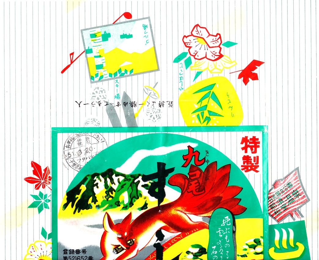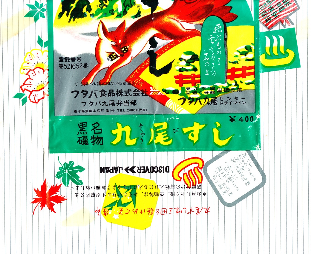1976(昭和51)年3月20日の調製と思われる、昔の黒磯駅弁の包装紙。大きなものなので分割してスキャンした。那須の山、九尾のキツネ、殺生石(せっしょうせき)前の句碑「飛ぶものは雲ばかりなり石の上」を描く。その絵柄は21世紀の復刻版にも使われる。なお、調製印に「千葉県船」の文字があるため、雉焼栗めしや下記の九尾釜めしと同じく、東武船橋駅など千葉で売られたものだろう。