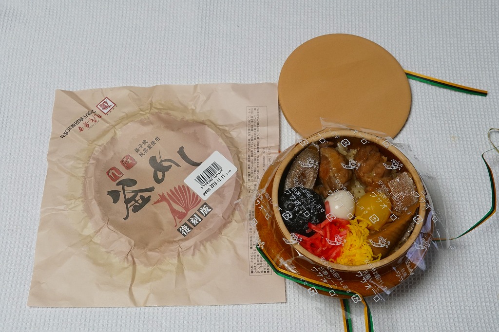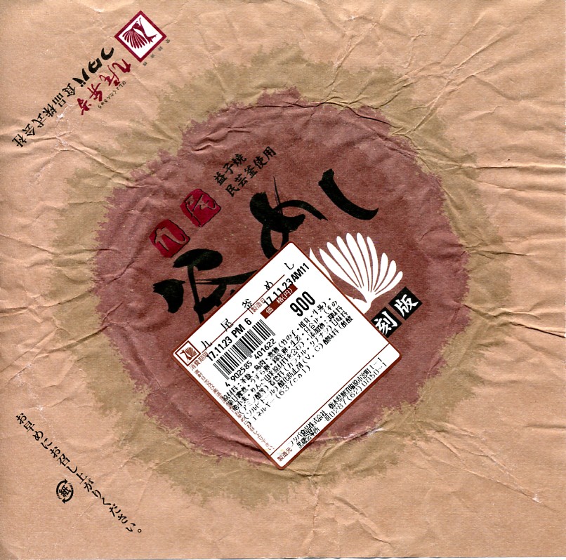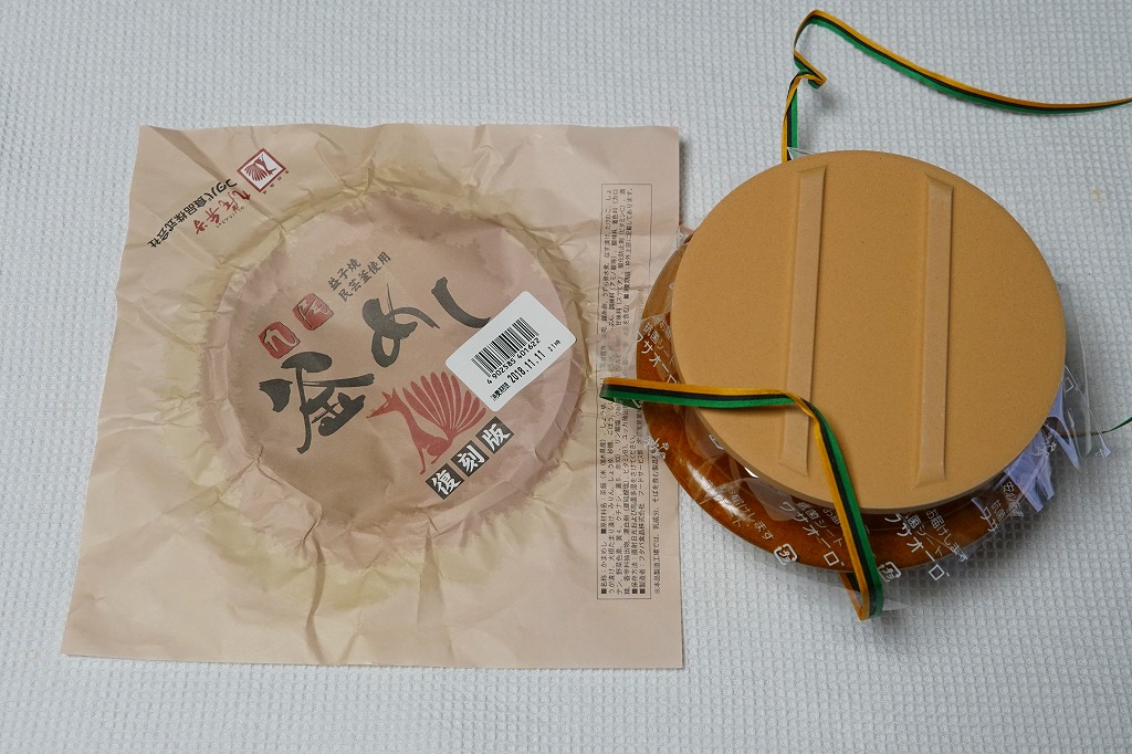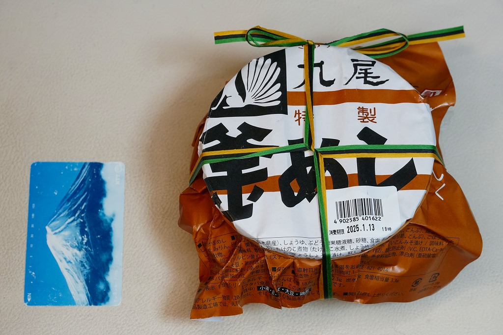 食べれば普通の釜飯。しかしふたの向き、ゴムで広がりを押さえた掛紙の見せ方、紙ひものしばり具合、長目の割りばしに大きめのナプキンと、食品表示ラベルの貼り方を除き、釜飯駅弁としての外観の整然さは日本一級かと。そういう周辺部分のしっかりとしたつくりも、また味を出す。