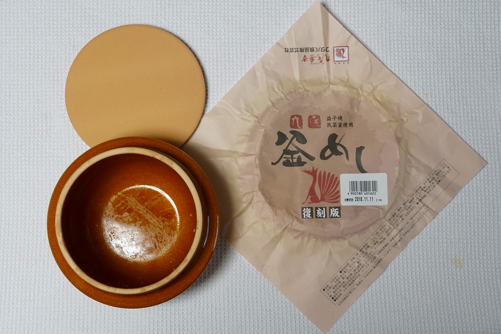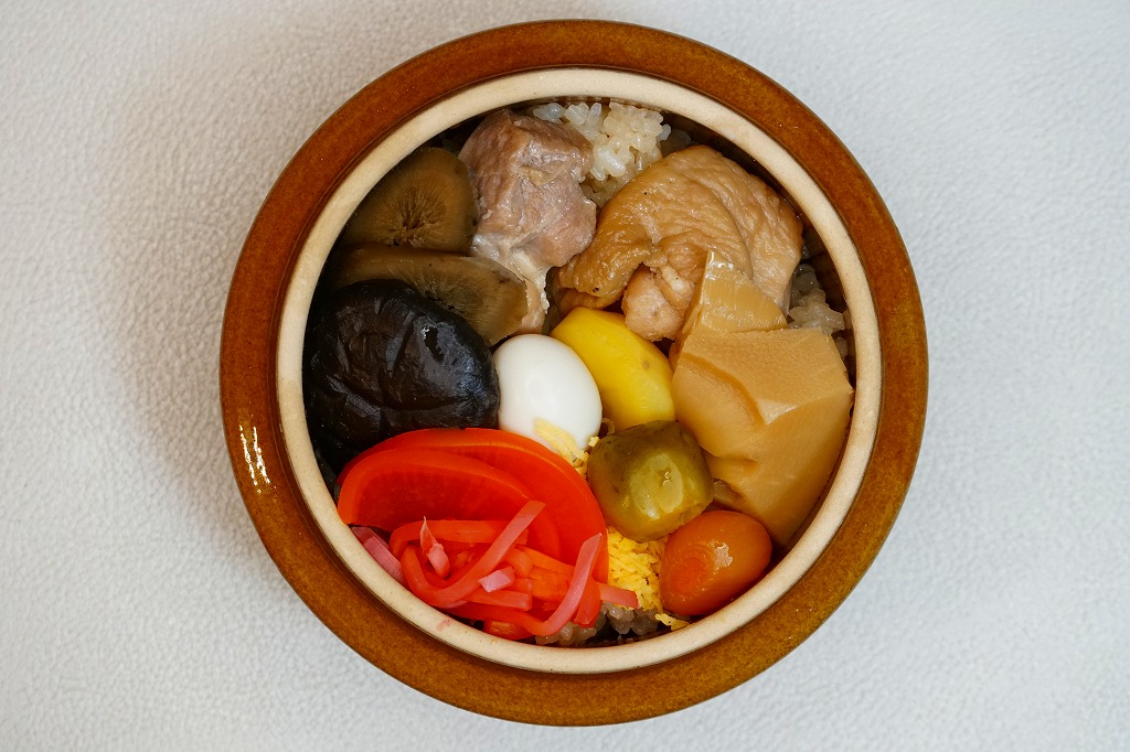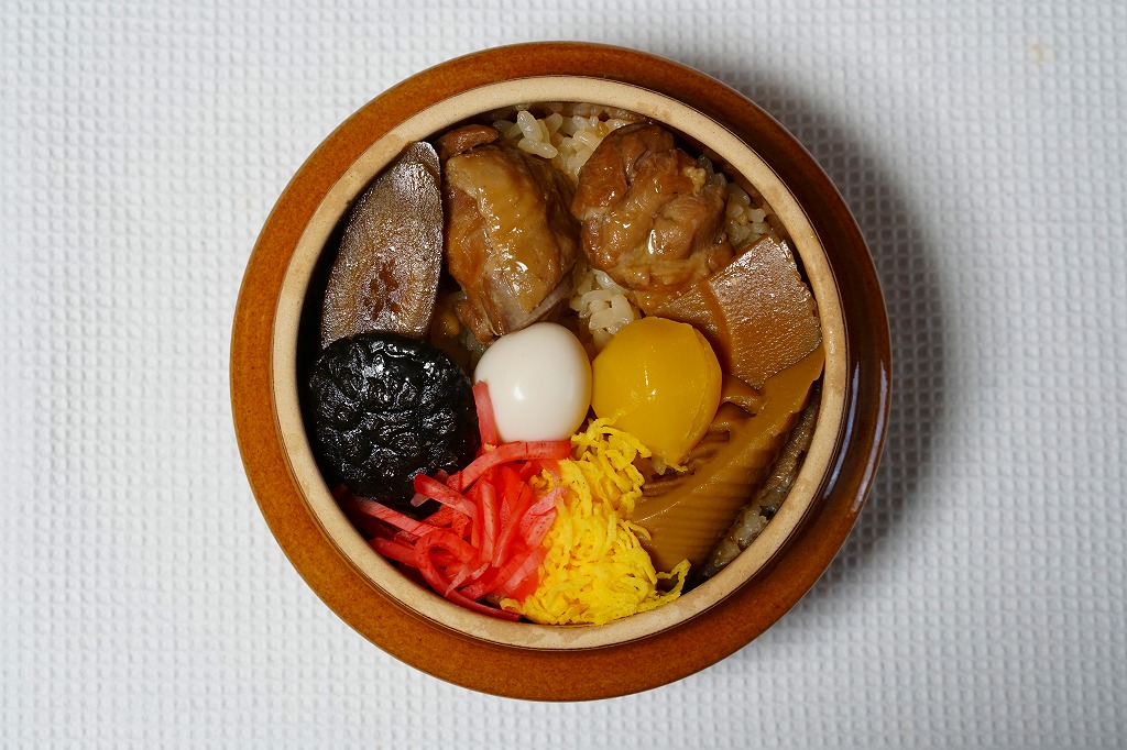 ふたにあった九尾の狐の絵柄は復刻されなかったが、陶製の釜飯駅弁向け容器を使い、現役時代と同じ絵柄の掛紙をかける。中身は茶飯を鶏肉、たけのこ、ごぼう、しいたけ、錦糸卵、紅生姜、栗で覆い、これは忠実に復刻されている。今回の印象としては、茶飯がたっぷり、具が少なめで、御飯のみを食べ進めたような感じ。価格は2018年の購入時で930円、2024年時点で1,000円、2025年時点で1,200円。