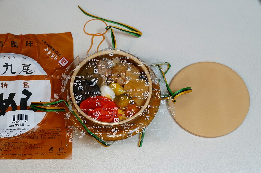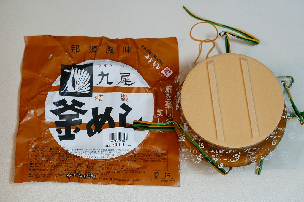 2025(令和7)年1月の京王百貨店の駅弁大会で輸送販売。「第1回大会ベスト5復刻かけ紙」として、1966年の第1回大会で第1位の鳥取駅「かに寿し」と第2位の黒磯駅「九尾釜めし」と第3位の新津駅「えびめし」と第4位の森駅「いかめし」と第5位の浜松駅「うなぎ飯」を、当時の掛紙をかけて販売した。これはその黒磯駅版で、当館で収蔵していない絵柄の掛紙をかけた。容器と中身と価格は、常時の復刻版である上記の今のものと同じ。