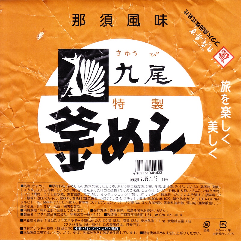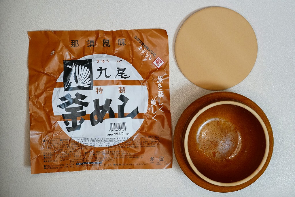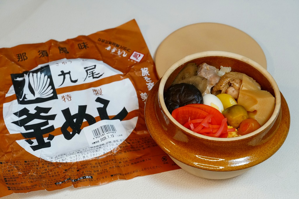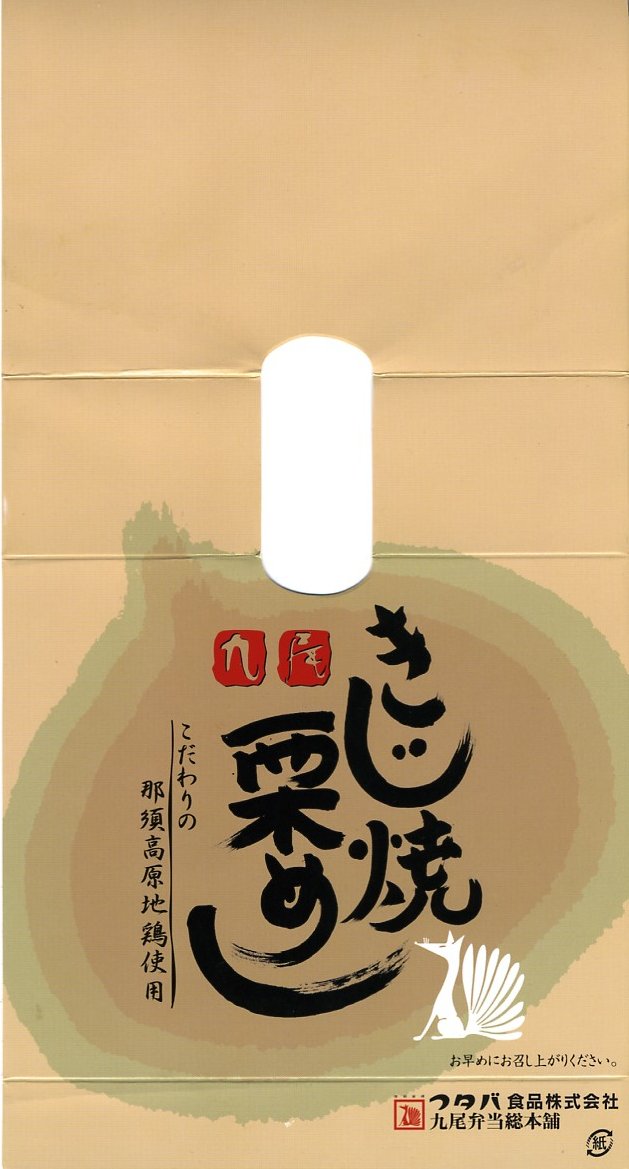 かつての黒磯駅の名物駅弁「九尾釜めし」の復刻版。2005(平成17)年11月限りですべての黒磯駅弁が失われた後、2012(平成24)年の秋に当時の駅弁屋であるフタバ食品が運営する、東北自動車道下り線の上河内サービスエリアで復活した。2016(平成28)年の秋までに土日曜日に限り、JR宇都宮駅の駅ビル「PASEO」の1階にある店舗「縁(えにし)」で買えるようになり、2020(令和2)年の同店の閉店で2階の土産物店「とちびより」へ移動した。