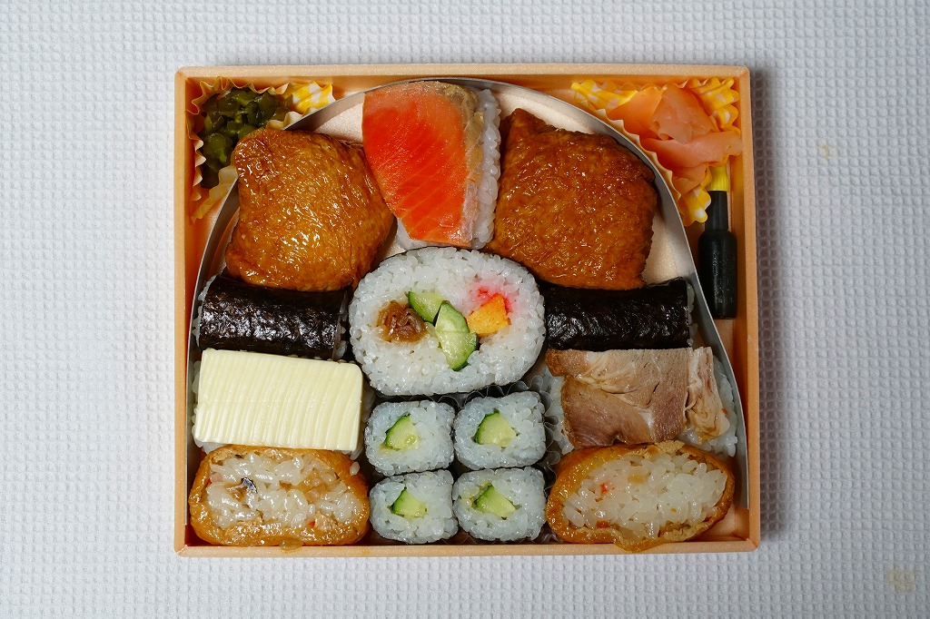 掛紙の絵柄は昭和時代のものを復刻した。中身は稲荷寿司2個、五目いなり2個、きゅうりの細巻き4個、キュウリと玉子とかんぴょうの太巻き1切れ、サーモン寿司、チーズ寿司、チャーシュー寿司、きゅうり漬、ガリ。