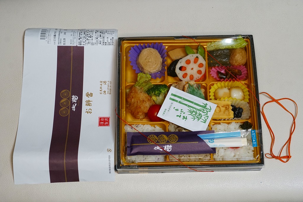 「大樹」とは、下今市駅と鬼怒川温泉駅を結ぶ東武鉄道のSL列車の名前であり、シンプルなデザインの掛紙に列車のロゴマークを使い、駅弁の名前とする。箸袋にも大樹のロゴ。平たいプラ容器の9区画の中身は、日の丸御飯、湯波としめじの御飯、ゆかり御飯、湯波、煮物、肉団子とカボチャと志そまき漬唐辛子、鶏唐揚と野菜、日光HIMITSU豚と「C11207」焼き印入り玉子焼、白玉柚子みそ添えとサヤ黒豆。日光やSLにこだわるも、食べてそんな感じもしない、幕の内タイプあるいはおつまみ豊富なお弁当。