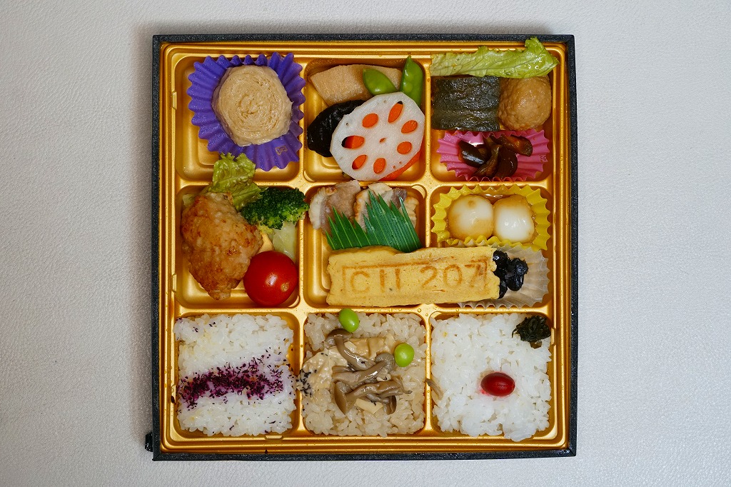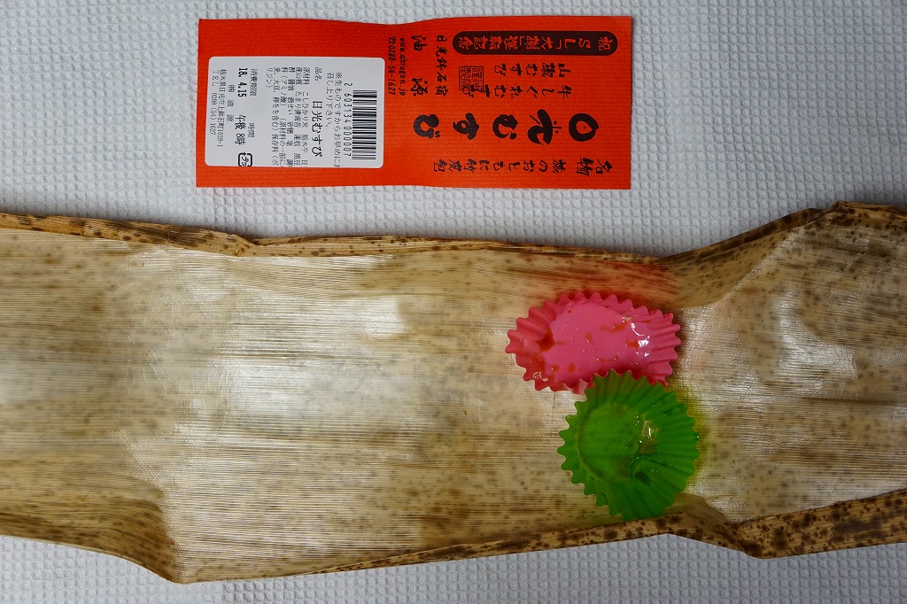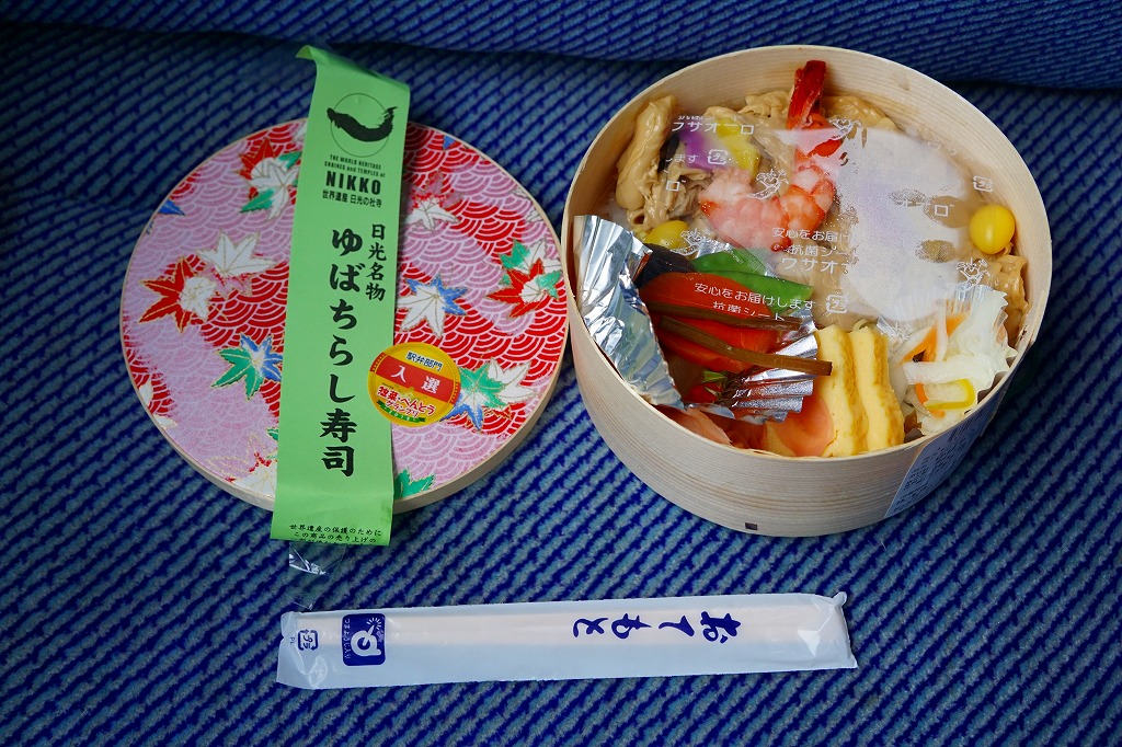 木を紙で補強した正方形のエコ容器に発泡材のふたをして、鷲のような風呂敷で包む。これに酢飯を詰め、ゆば巻きの炙りを据え、たけのこ、にんじん、小海老揚げ、ダイズチーズ、れんこん、しいたけ、かんぴょう、枝豆、卵そぼろ、桜でんぶ、ごまを散らし、おはぎを添える。ちらしずしであることを考えても、見栄えはもう一息に思えるが、これで日光と栃木を感じ取ってもらえただろうか。
