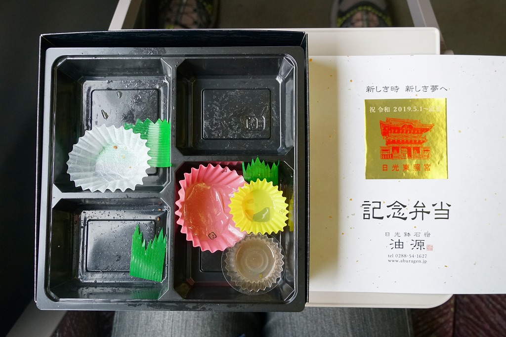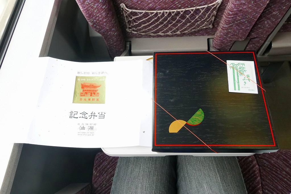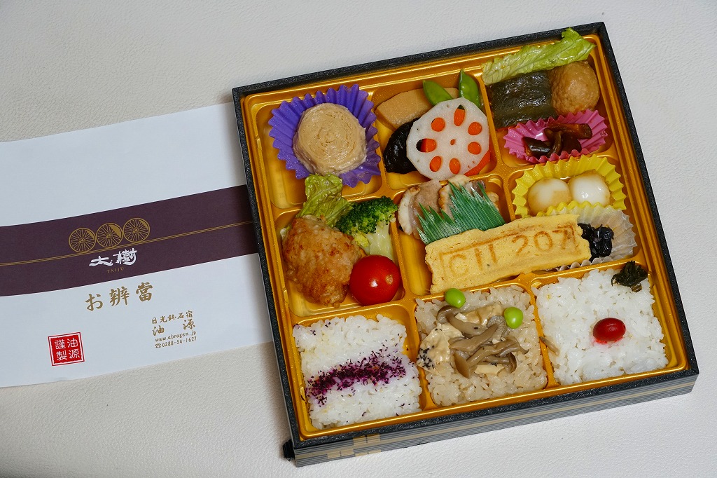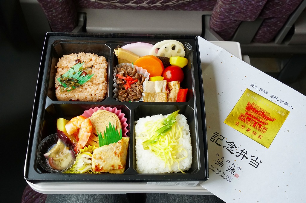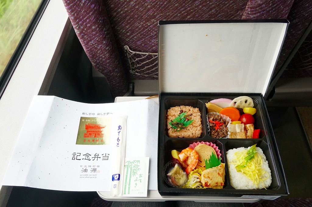 日光東照宮の四百年式年大祭の開催を記念し、「日光東照宮400年式年大祭記念弁当」の名で2015(平成27)年5月31日に東武日光駅、下今市駅、鬼怒川温泉駅にて1,300円で発売。翌年に「日光東照宮記念弁当」へ改称するも、外観や中身は変わらなかった模様。今回はさらに改元を記念して、2019(平成31)年4月27日から、掛紙に「祝令和2019.5.1〜記念」「新しき時 新しき夢へ」と入れ、値段を200円上げた。