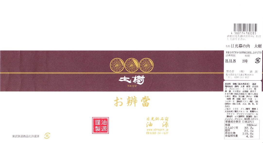 2017(平成29)年8月10日の東武鉄道のSL列車「SL大樹」のデビューとともに発売か。竹皮に小さく平たい牛しぐれ煮のおむすび2個と、れんこん、黒豆、たまり漬を包み、商品名と「祝SL「大樹」運転記念」と書いて食品表示ラベルを貼った朱色の掛紙を合わせる。これはもしかすると駅弁発祥宇都宮説、竹の皮に握り飯2個とたくあんを包んで売ったというものを、おおむね再現したものか。中身の見栄えは宇都宮駅のそんな再現駅弁を、だいぶ貧相にしたように見えた。2022年までの販売か。