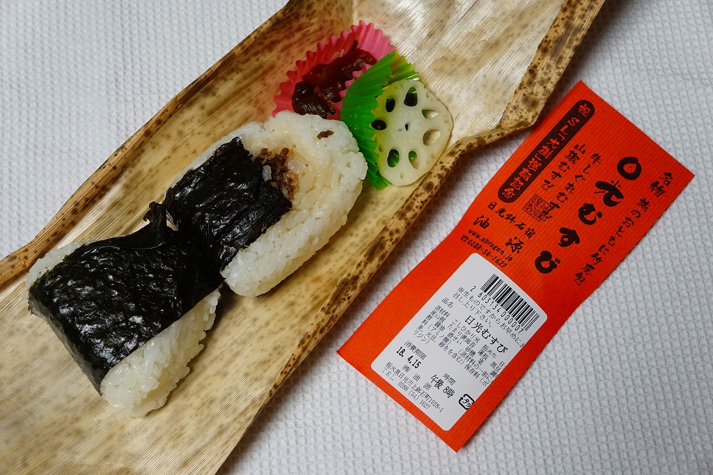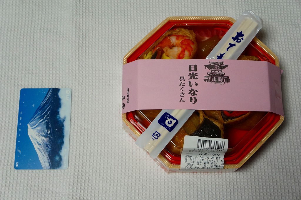 2019(令和元)年の年末までに発売か。東武日光駅の改札外待合室にふたつある売店のうちひとつ「東武日光売店」では、JR宇都宮駅の駅弁も売られる。これはJR宇都宮駅の駅弁屋が「東武日光売店限定販売」とうたう駅弁。箸袋を包む掛紙のような紙に、商品名としてそう明記してある。