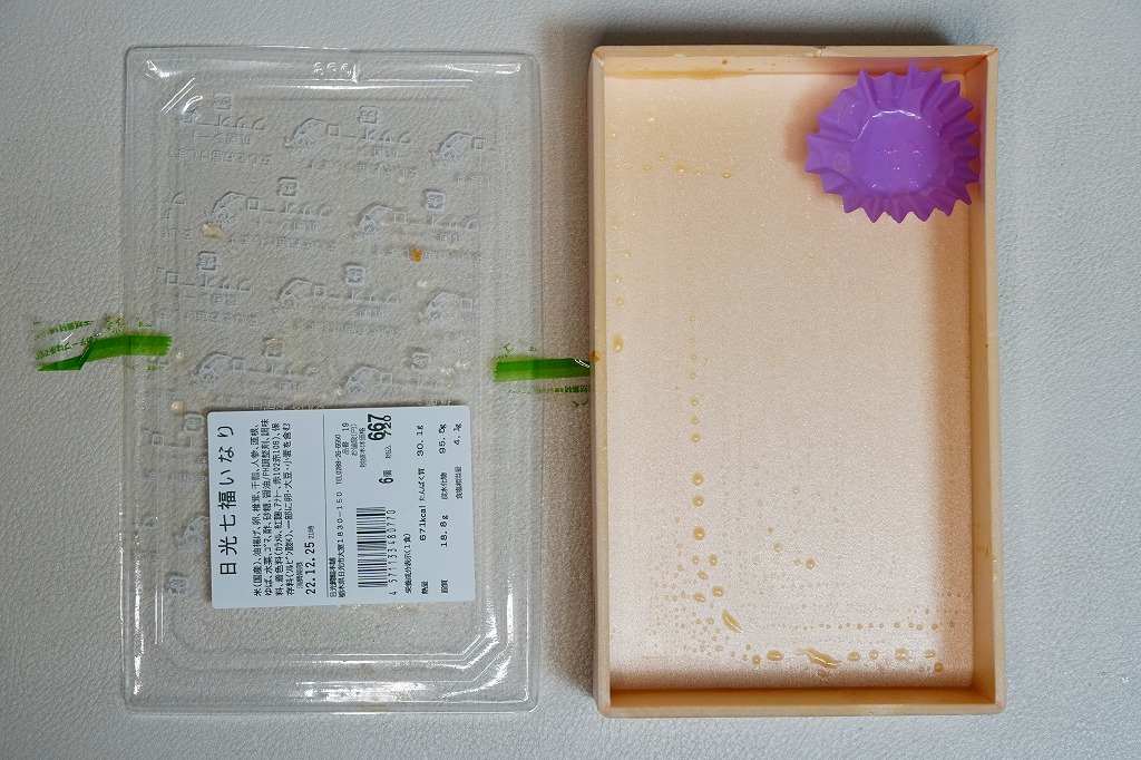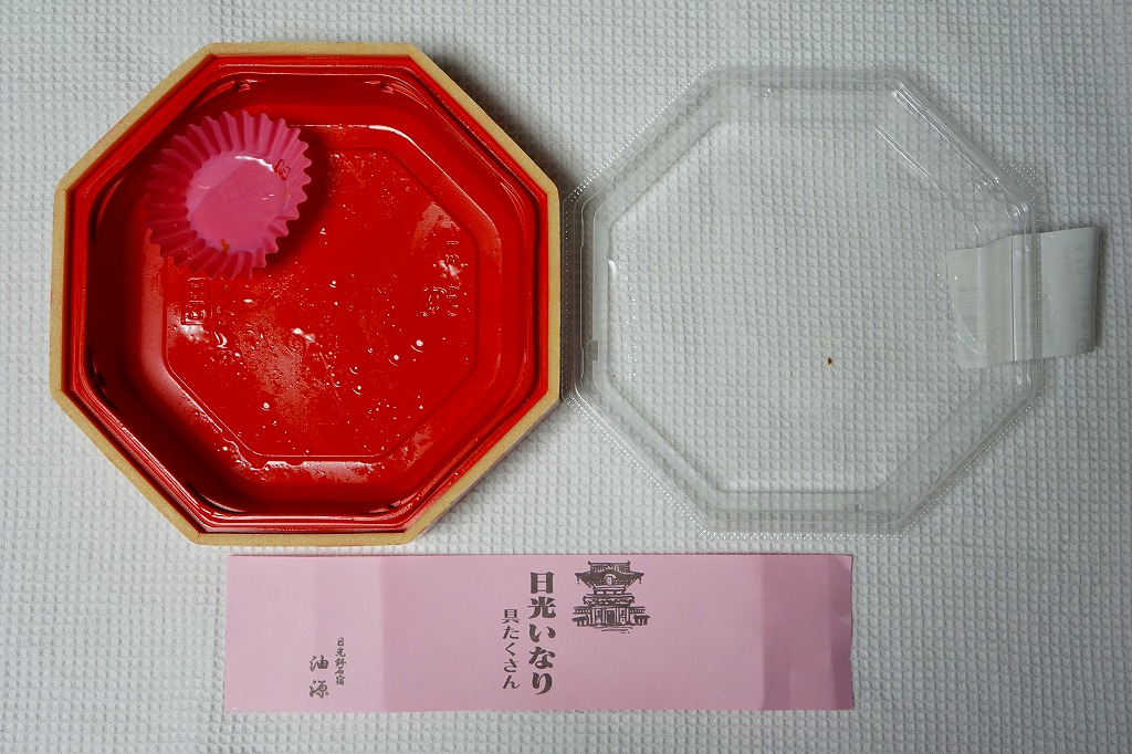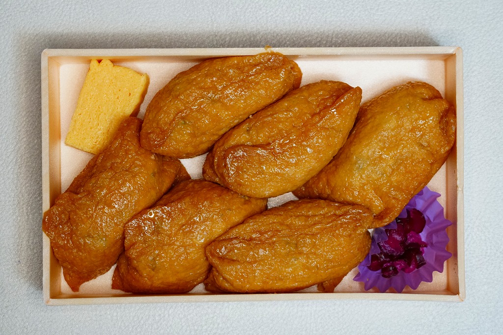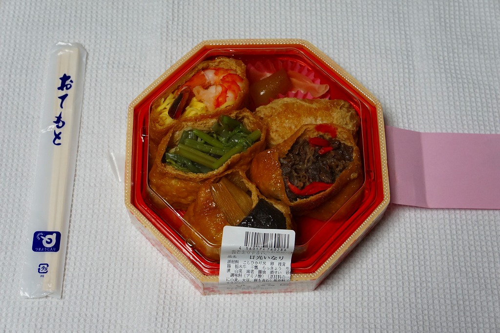 2019(令和元)年の発売か。写真のとおり、おいなりさん6個に極小の玉子焼と柴漬けを添えたお惣菜。見えないところに、稲荷寿司の具として、錦糸卵、しいたけ、かんぴょう、にんじん、れんこん、湯波、水菜が細かく混ざり、これでうまみが出る。日光埋蔵金弁当などの駅弁を持つ調製元の商品で、駅弁売り場で売られる商品なので、掛紙を巻かないことが不思議に思える。価格は2019年の発売時で650円、2022年の購入時で730円、2024年時点で780円、2025年時点で850円。