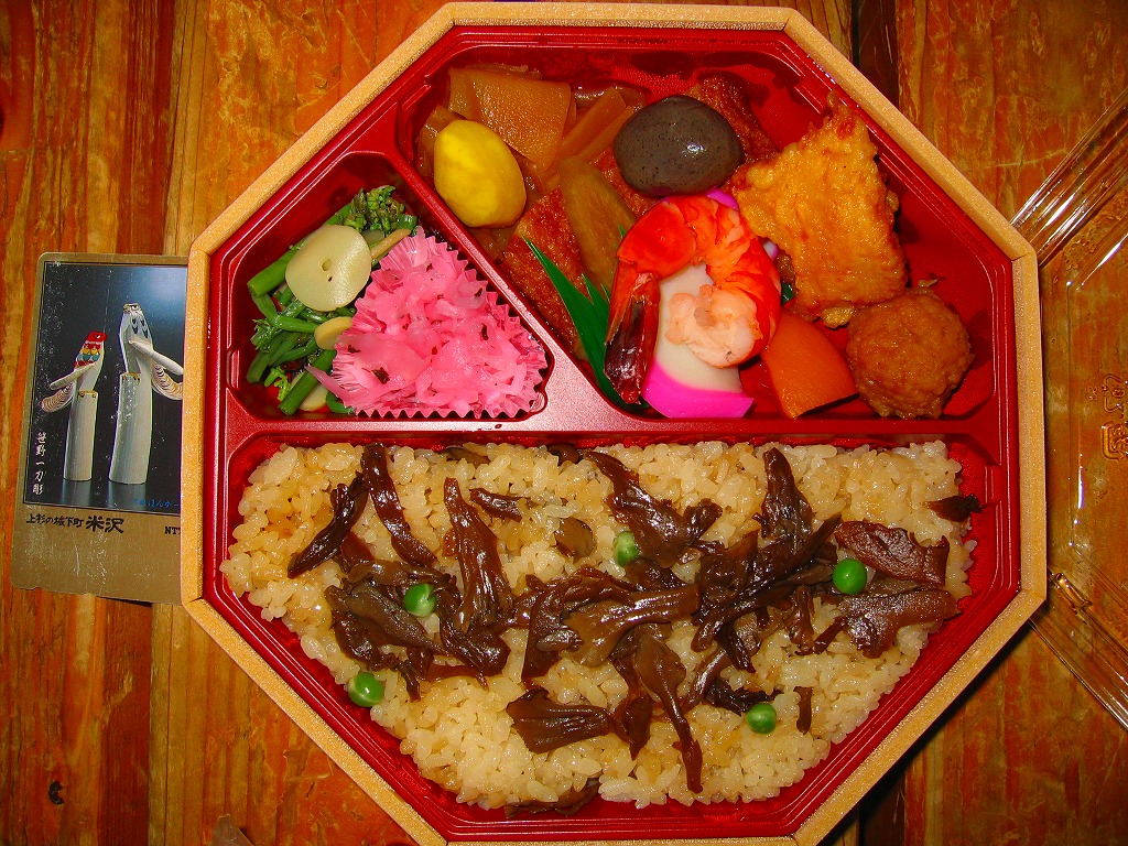 発泡材枠にトレーを接着した底の浅い八角形の容器に、セロテープで駅弁の名前を記した帯を貼る。中身は日光舞茸の茶飯にかんぴょうと、山菜や薩摩揚や蒲鉾や玉こんにゃくや海老など。味はなんとなく団体客向け旅館の朝食バイキングのような感じだが、御飯もおかずもとても柔らかく、元気な高齢者という東武日光駅の主要客層に配慮されたと思われるもの。なお、2010年現在でこの駅弁は販売されていないとのこと。