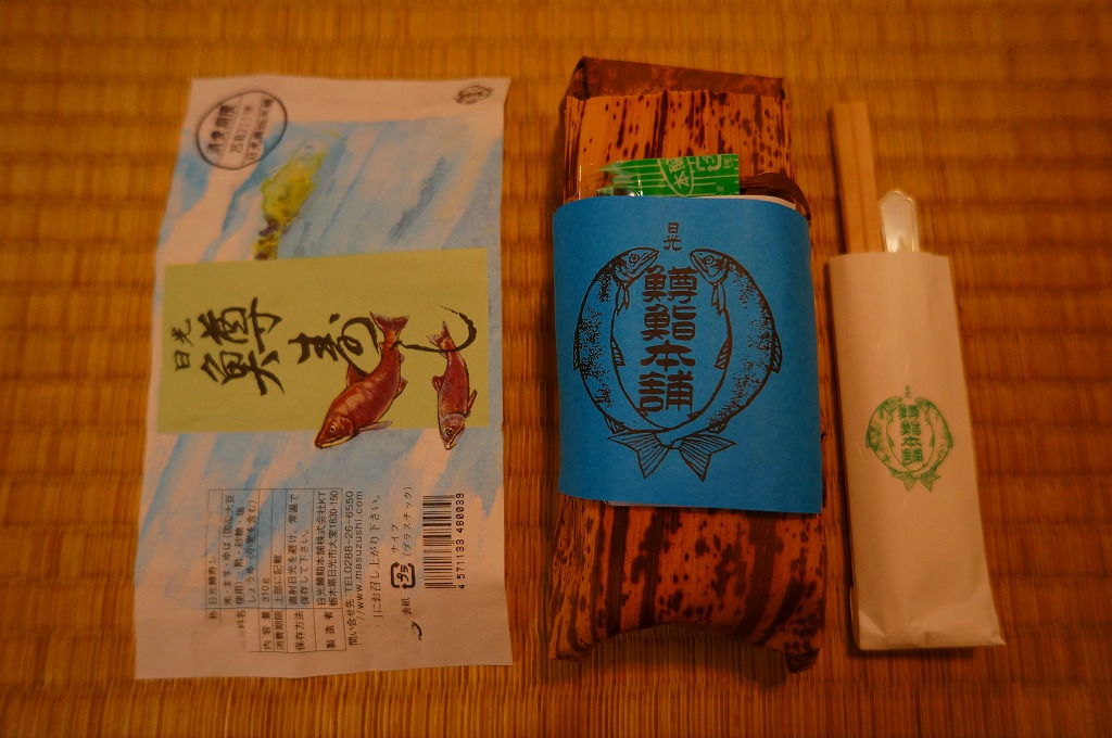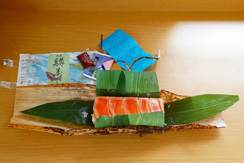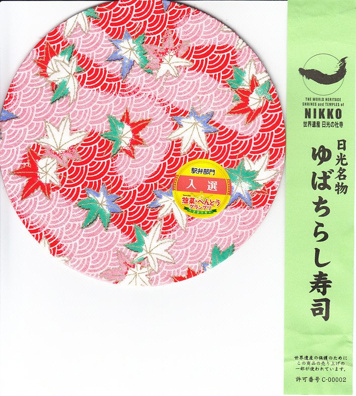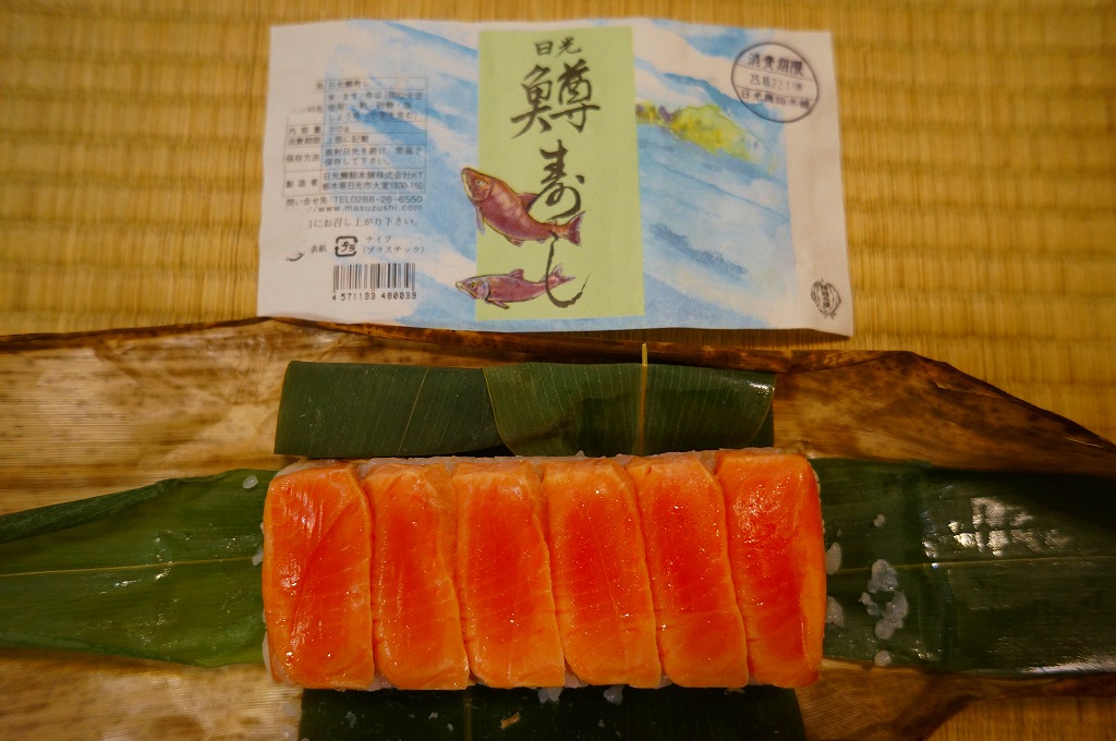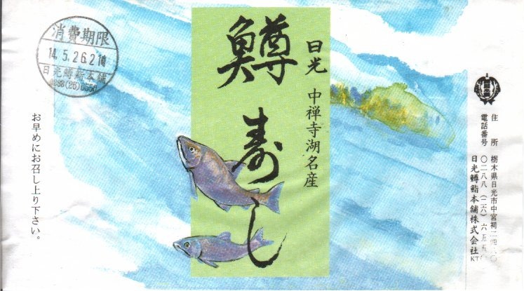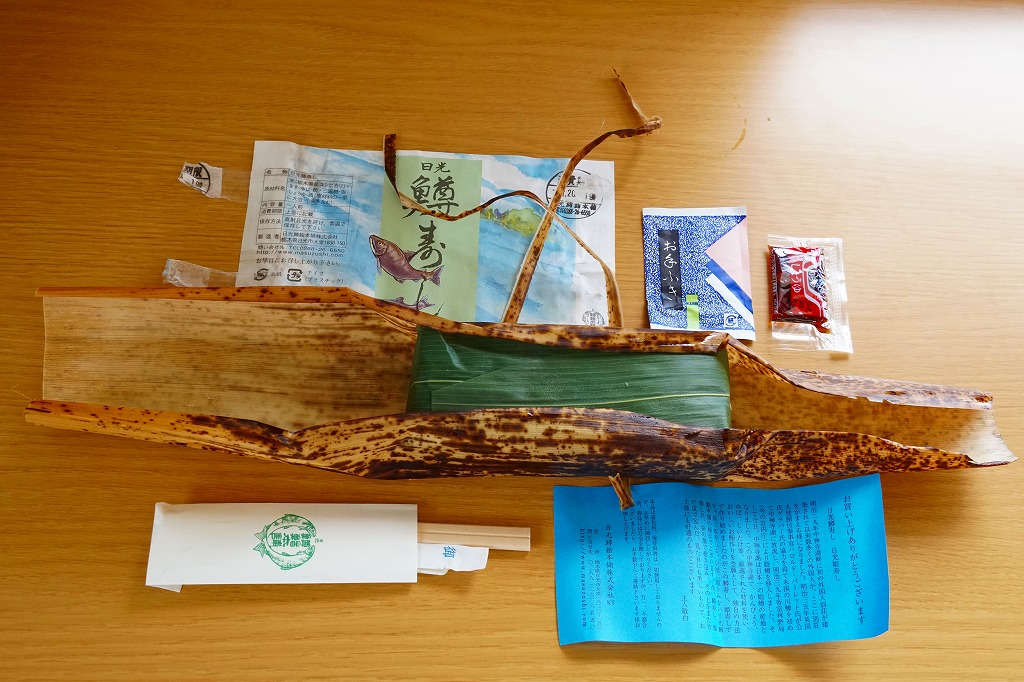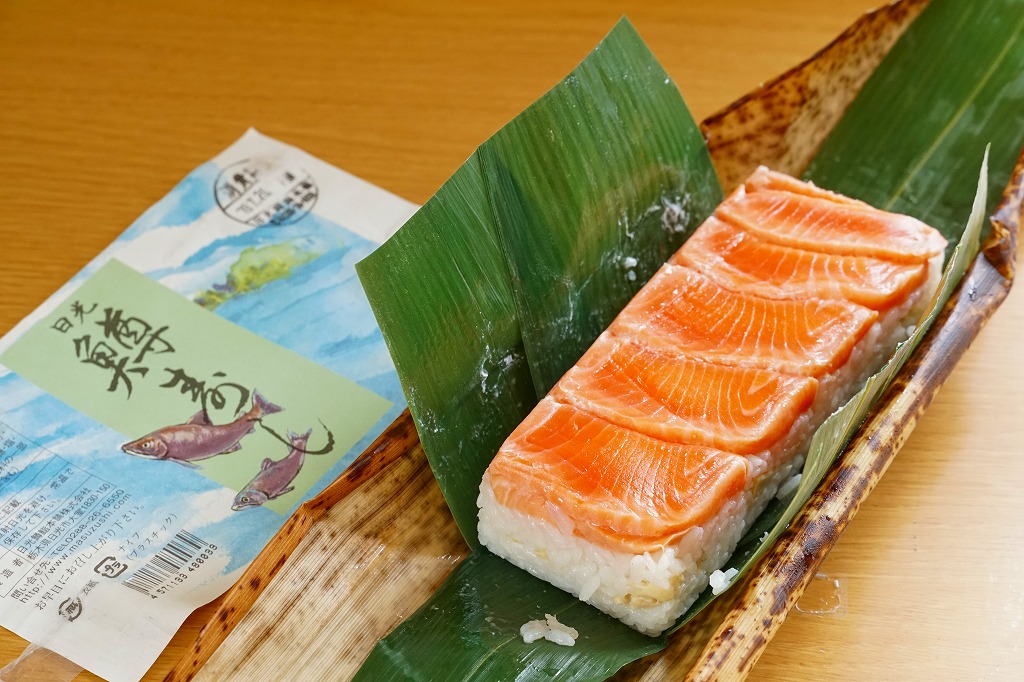 駅弁としては1992(平成4)年5月に、東武日光駅で発売した模様。ゆばを挟んだ直方体の酢飯に、中禅寺湖特産というヒメマスの身を寿司ネタ大にして貼り、笹の葉で目張りしてから竹の皮で包み、しおり、しょうゆ、おてふき、割りばし、ナイフを添えて掛紙で巻く。値段は高いが味はうまいの一言。価格は2002年時点で1,260円、2014年4月の消費税率改定から1,300円、2023年時点で1,500円。