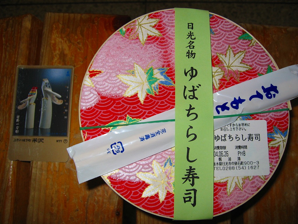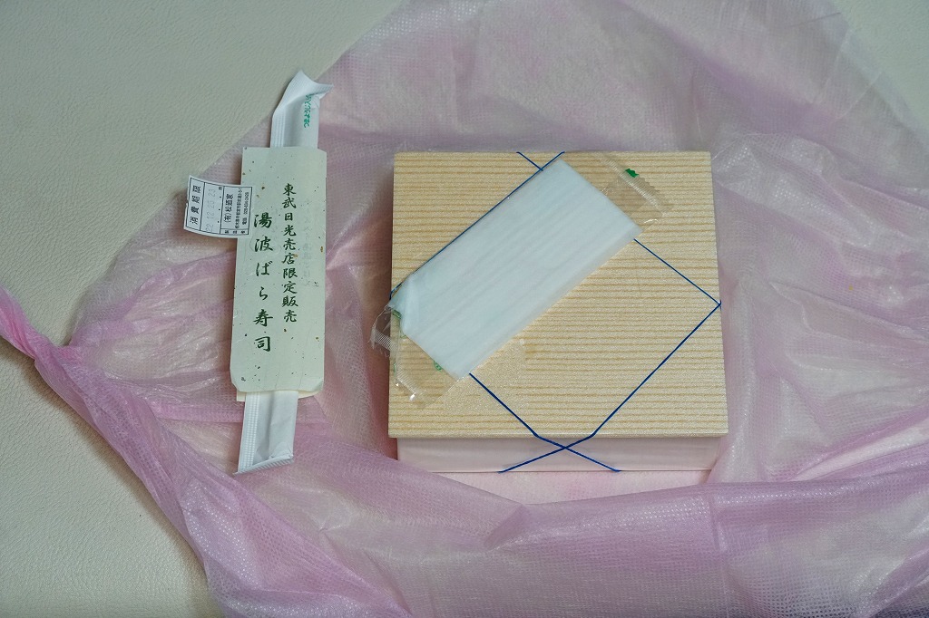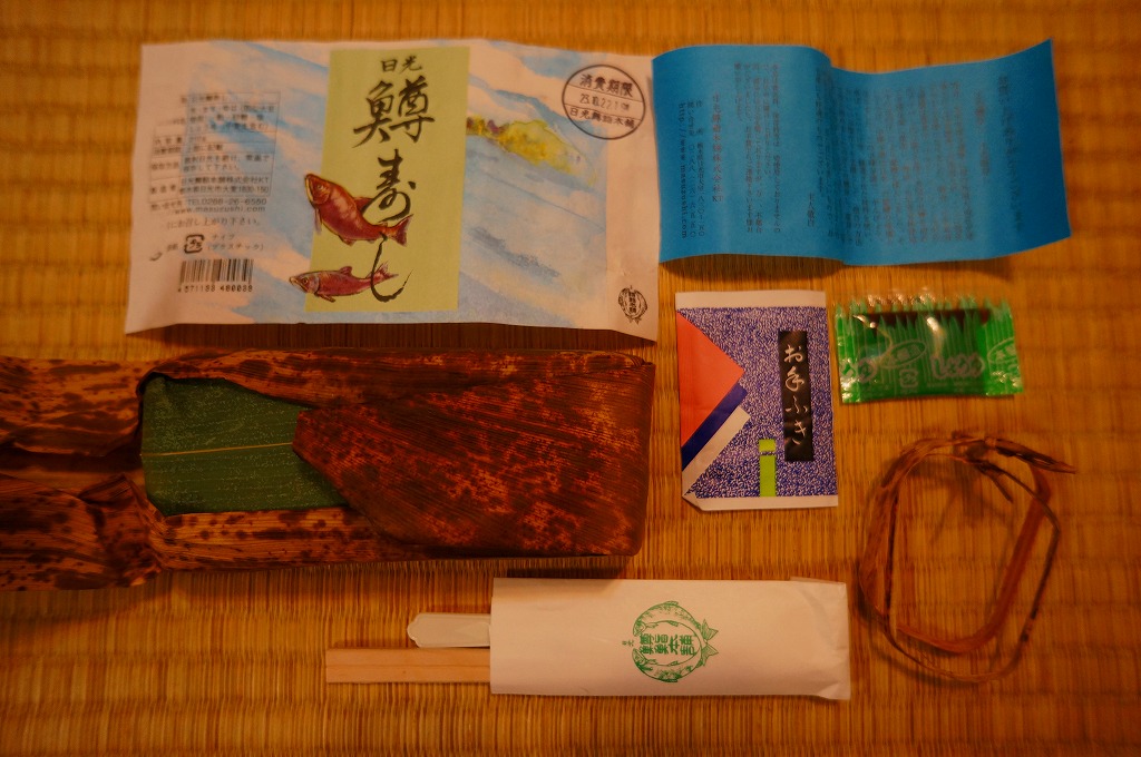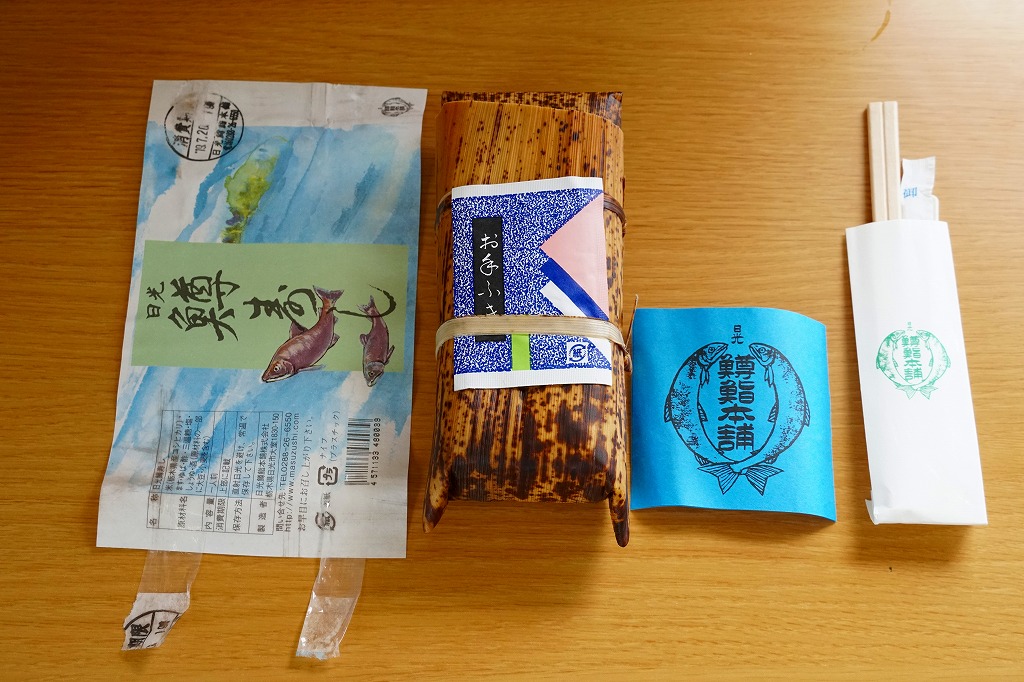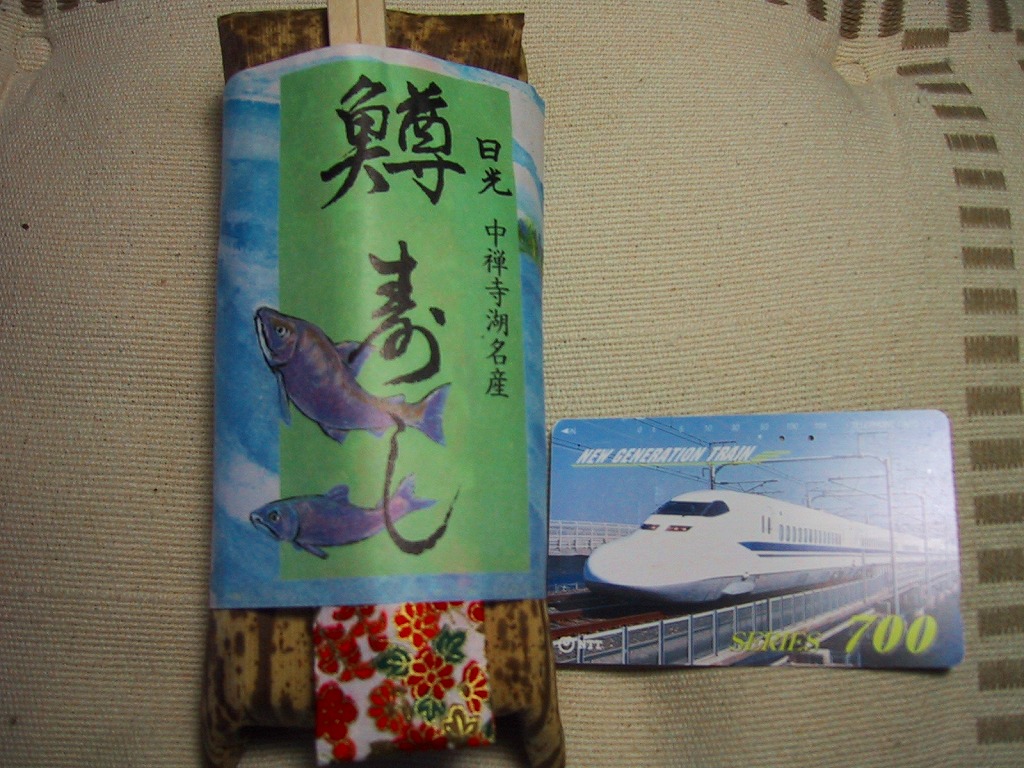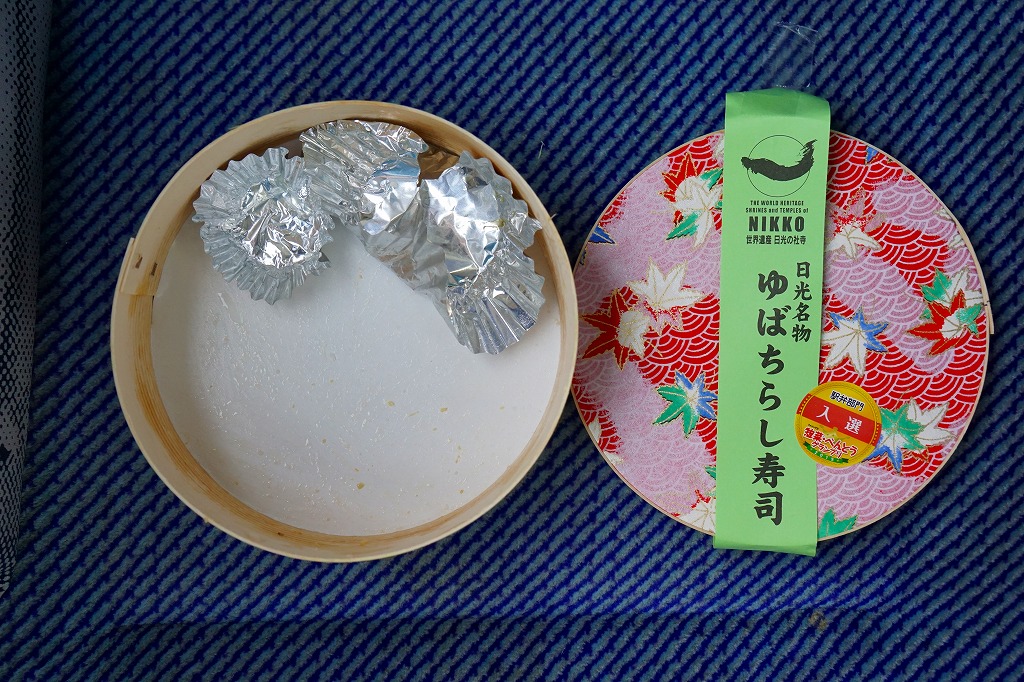駅弁としては1992(平成4)年5月に、東武日光駅で発売した模様。ゆばを挟んだ直方体の酢飯に、中禅寺湖特産というヒメマスの身を寿司ネタ大にして貼り、笹の葉で目張りしてから竹の皮で包み、しおり、しょうゆ、おてふき、割りばし、ナイフを添えて掛紙で巻く。値段は高いが味はうまいの一言。価格は2002年時点で1,260円、2014年4月の消費税率改定から1,300円、2023年時点で1,500円。
