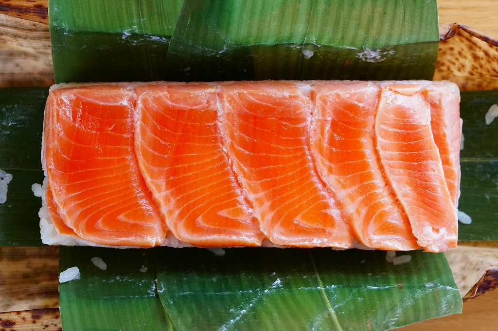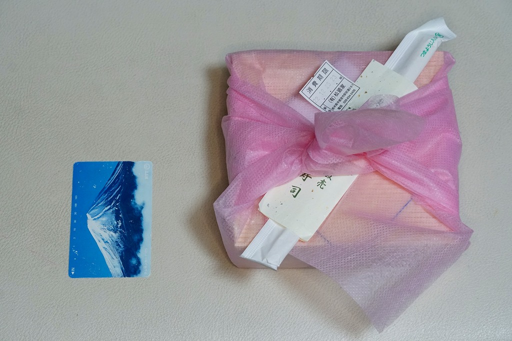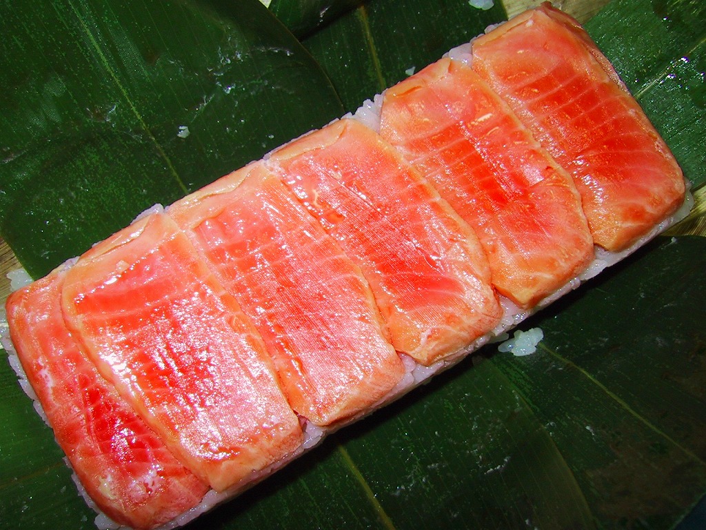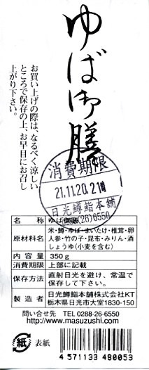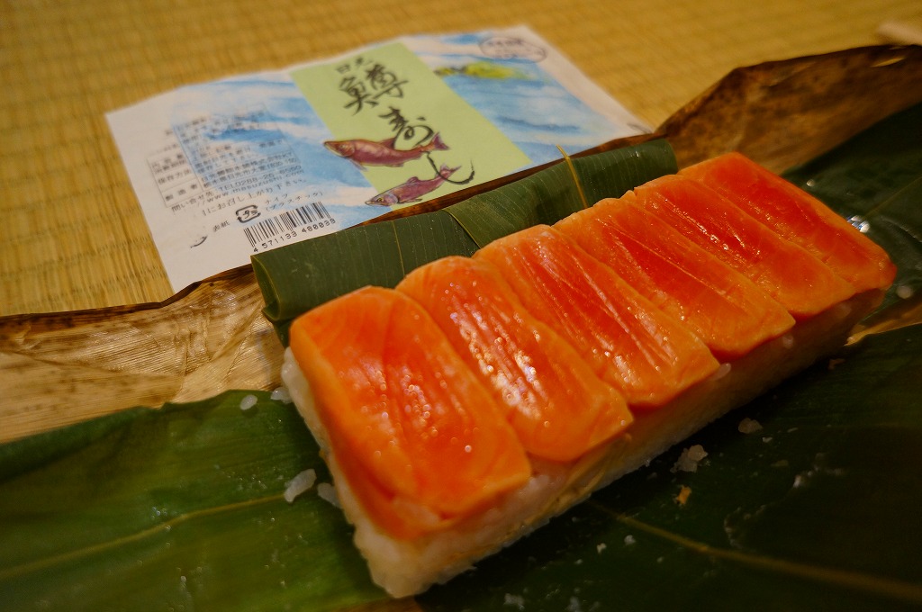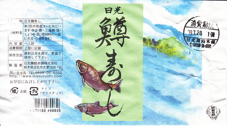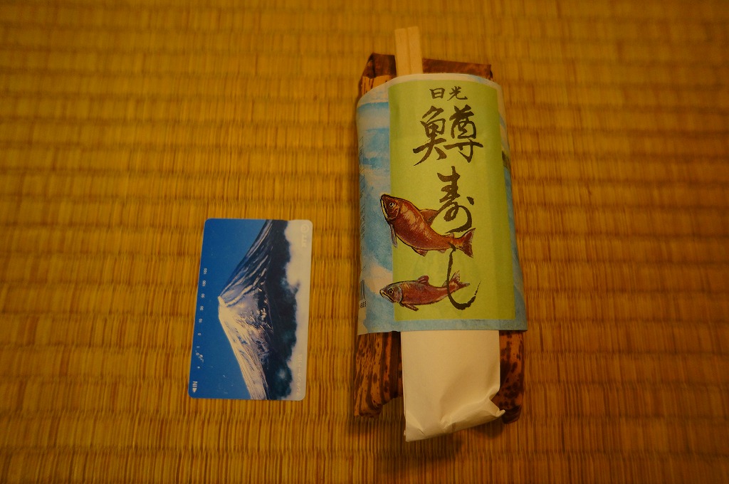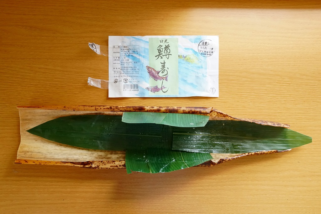 駅弁としては1992(平成4)年5月に、東武日光駅で発売した模様。ゆばを挟んだ直方体の酢飯に、中禅寺湖特産というヒメマスの身を寿司ネタ大にして貼り、笹の葉で目張りしてから竹の皮で包み、しおり、しょうゆ、おてふき、割りばし、ナイフを添えて掛紙で巻く。値段は高いが味はうまいの一言。価格は2002年時点で1,260円、2014年4月の消費税率改定から1,300円、2023年時点で1,500円。