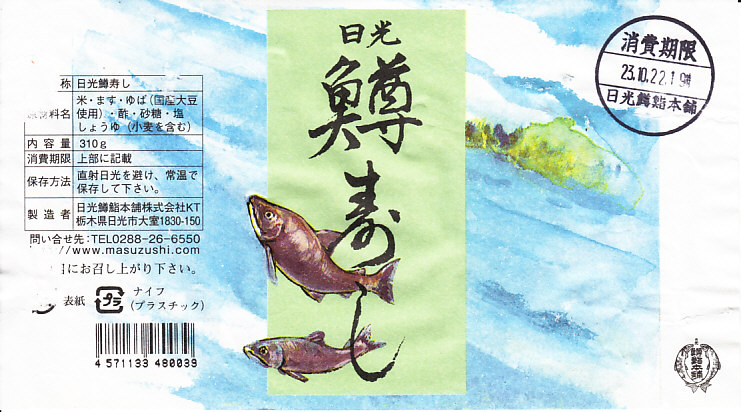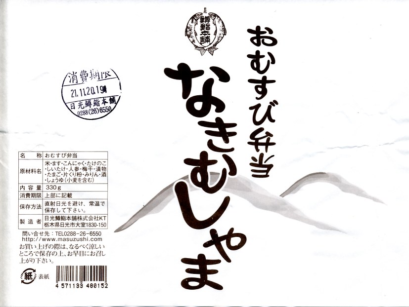 2011(平成23)年10月21日に購入した、東武日光駅弁の掛紙。上記の2019年のものとほぼ同じだが、内容量が一人前でなく「310g」であったり、製造者に製造所固有記号が付いていたり、消費期限の捺印の日付が平成表記だったりなどの差異はある。