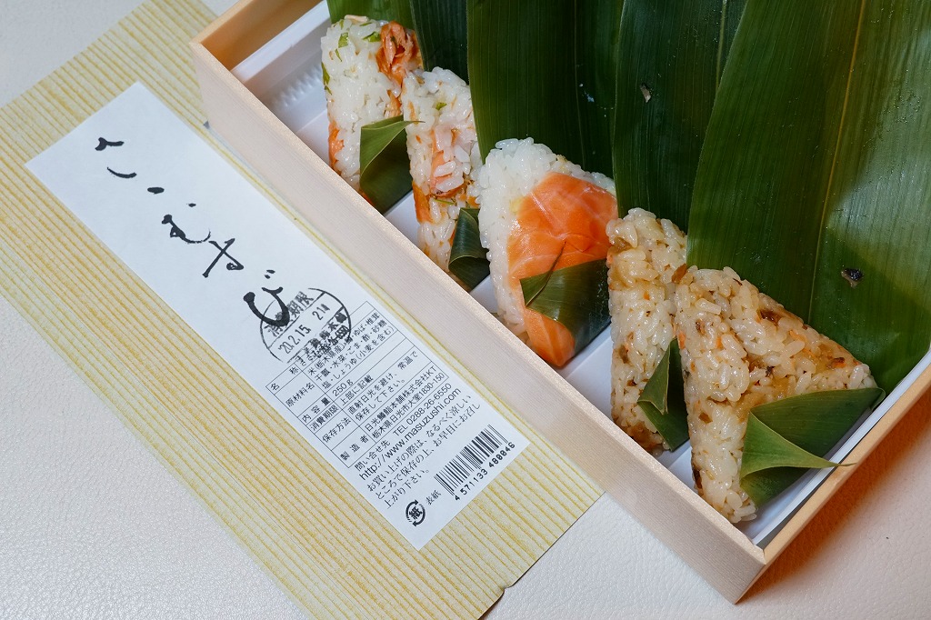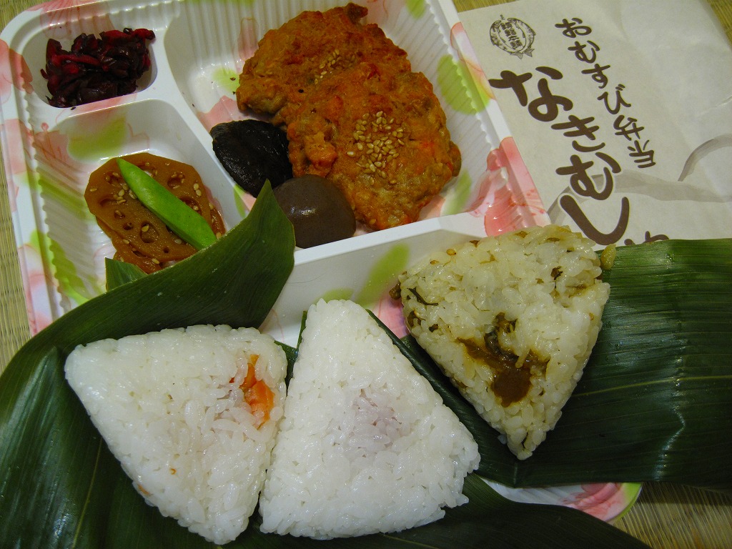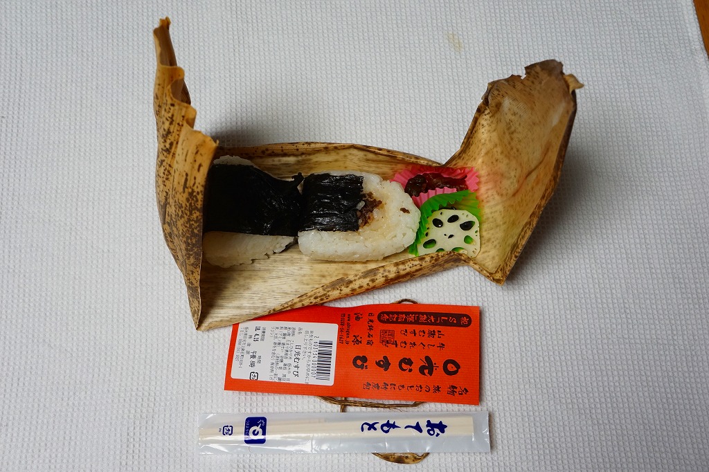 安物の惣菜弁当に使われていそうなプラ製の容器を使用、これに商品名と必要な情報を書いた薄い掛紙を巻いて、輪ゴムでしばる。中身は笹の葉にしっかり包まれた、マス、梅干、高菜のおにぎりが各1個と、魚ハンバーグ、こんにゃくとしいたけ、レンコンときぬさや、柴漬けが入る。