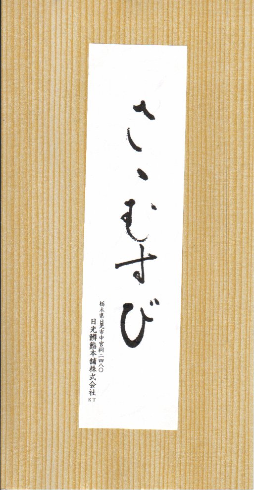 2002(平成14)年5月25日に購入した、東武日光駅弁の掛紙。絵柄は上記の2011年のものと変わらないが、当時は「中禅寺湖名産」の表記があり、掛紙そのものには食品表示がなかった。