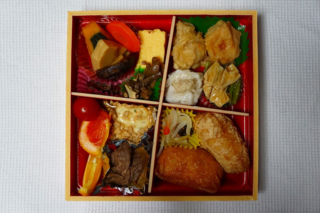2004(平成16)年頃の発売か。正八角形の容器に、具を見せたおいなりさん4個、見せない稲荷1個、らっきょう、生姜を詰める。いなりの具はすべて異なり、牛しぐれ煮、シイタケとかんぴょう、ワラビとゼンマイ、エビと錦糸卵、何もなしの5種。いろんな味が楽しめて賑やか。価格は2018年の購入時で620円、2020年時点で650円、2023年時点で720円。