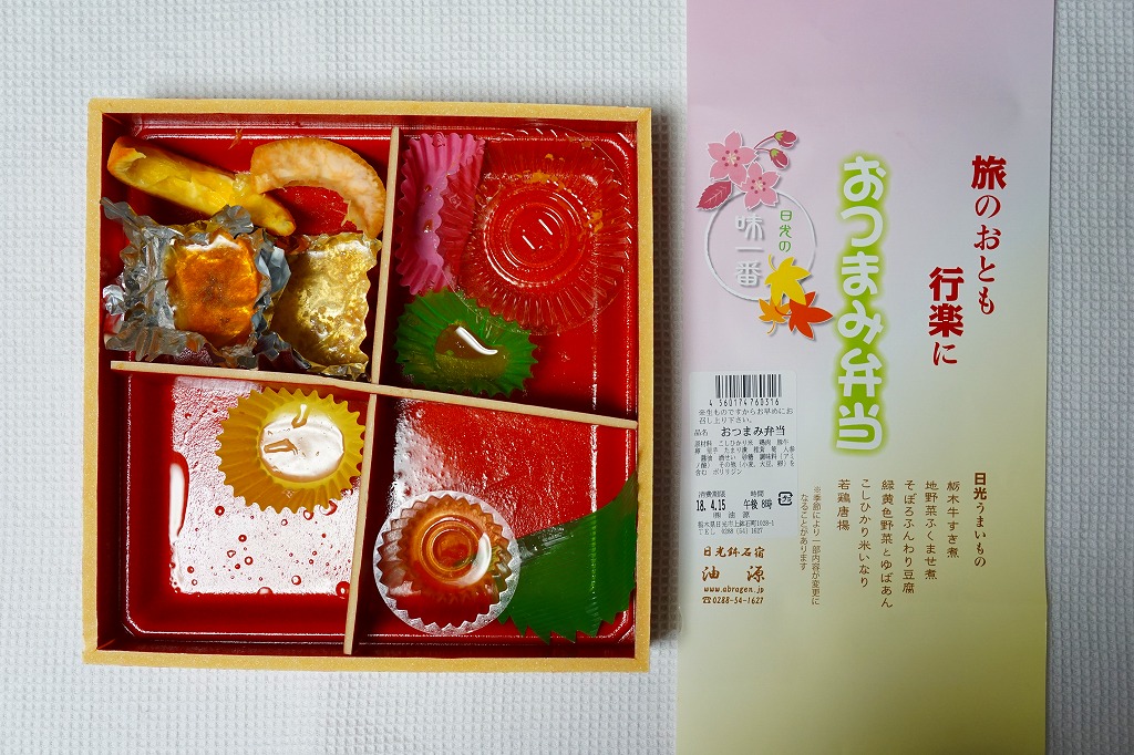 2013(平成25)年4月20日の発売か。松花堂の仕切りを少し曲げた4区画に、2種のおいなりさんと漬物、鶏唐揚2個と焼売と湯波あん、煮物と山菜と玉子焼、そぼろふんわり豆腐と牛肉煮とオレンジなどを詰める。名に違い、おつまみだけには特化していない、具だくさんのお弁当。価格は2018年の購入時で1,030円、2020年時点で1,050円。2022年までの販売か。
