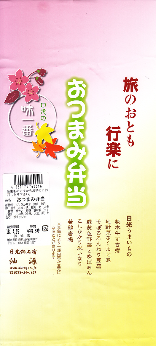 2002(平成14)年の発売。高さのある経木枠のわっぱ型容器を使用、そのフタには金縁紅葉の絵柄が貼り付けられ、輪ゴムと駅弁名付紙帯セロテープ留めで十字にしばり、割りばしを挟み込む。中身は湯葉混じりの酢飯の上の半分を湯波(ゆば)を敷き詰めて覆い、残りは玉子焼や煮物などを載せる。豆乳の加熱皮膜に地域性などないと思うが、なんとなく京都か日光くらいでしか駅弁にできなさそうな内容。容器も中身も上品に思える。価格は2015年の購入時で880円、2020年時点で930円。