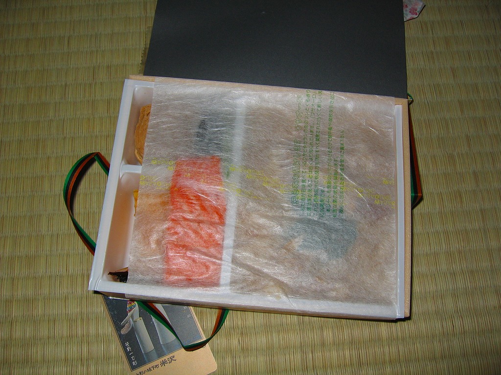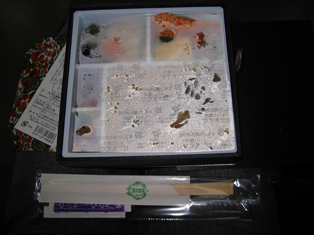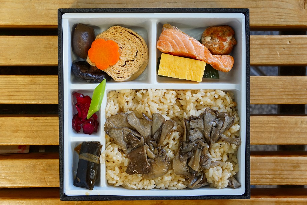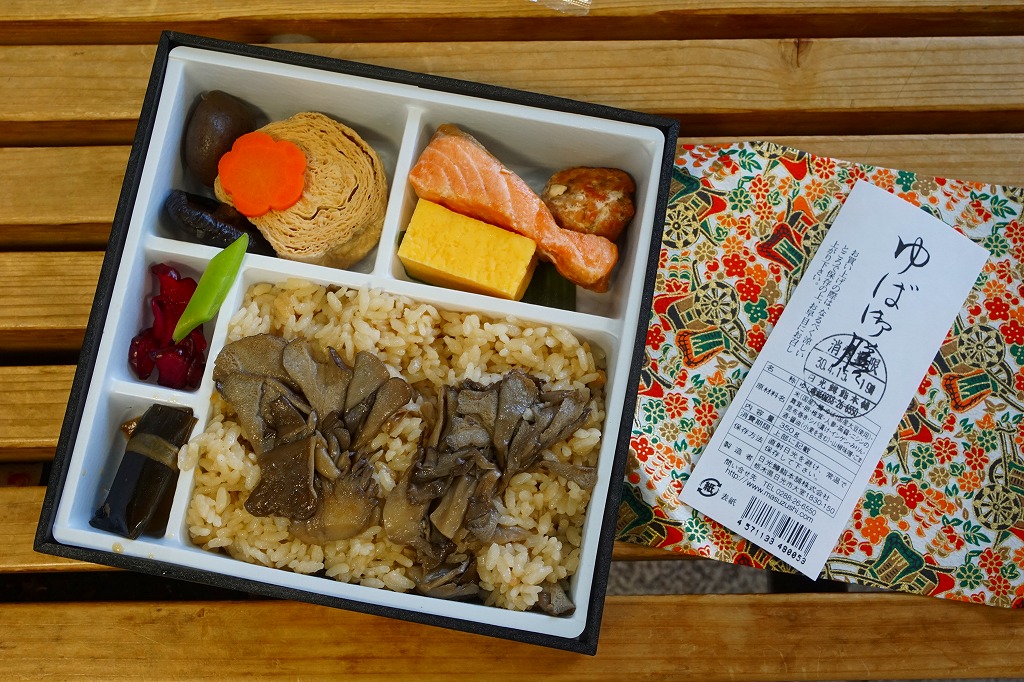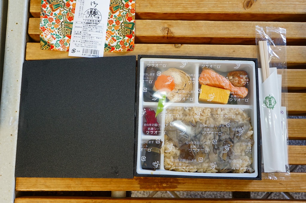 木目調で真っ黒な正方形の容器に、豪華絢爛な柄の和紙と駅弁の名前を記した短冊を載せて、ゴムで十字に留める。白いトレーに収まる中身は、マイタケ御飯にゆば巻、焼マス、椎茸とこんにゃく、玉子焼、昆布巻など。見栄えも中身も価格や内容以上の高級感を醸し出す。