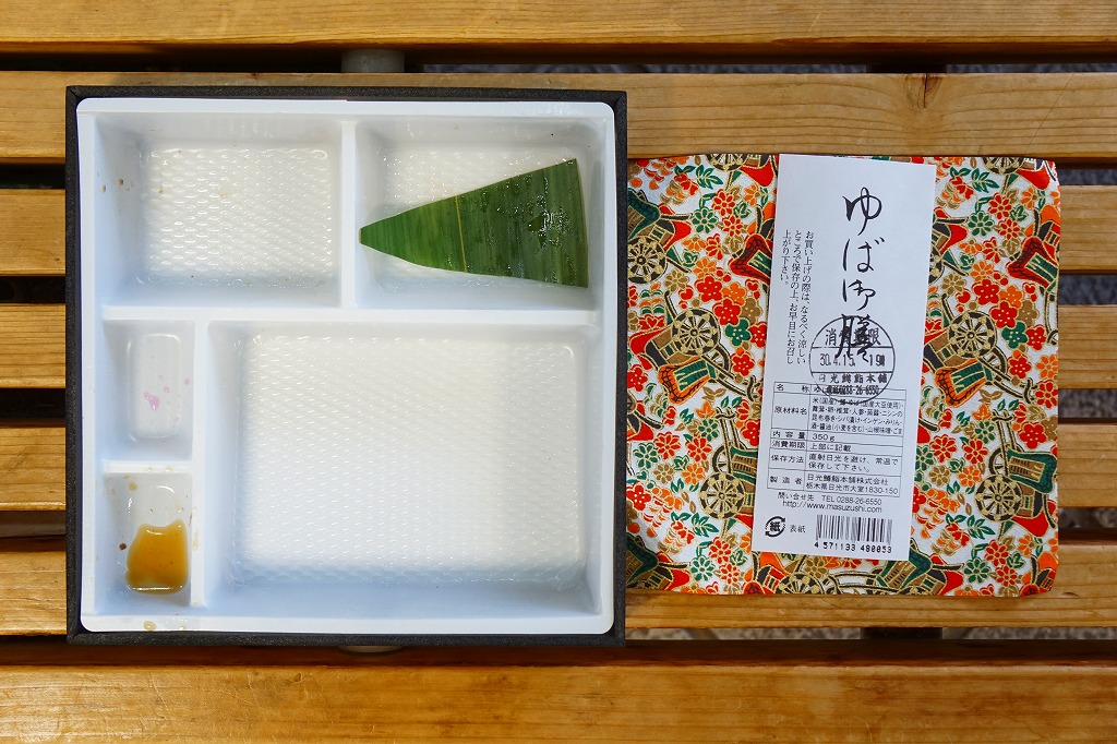 通常の駅弁では、焼き魚のサケをマスにするとグレードダウンとなるところが、こちらは調製元がマス寿司屋なので、サケに負けないか上回る厚みと香りがある。これは名前のとおりゆばの駅弁であり、中身としてはマイタケ弁当なのだけど、焼マスの存在感が最も高い感じがした。東武日光駅限定駅弁の中では最も高い評価を集めているらしい。価格は2004年時点で1,050円、2014年4月の消費税率改定で1,080円、2020年時点で1,150円、2022年時点で1,200円、2023年時点で1,250円、2024年時点で1,350円、2025年時点で1,400円。