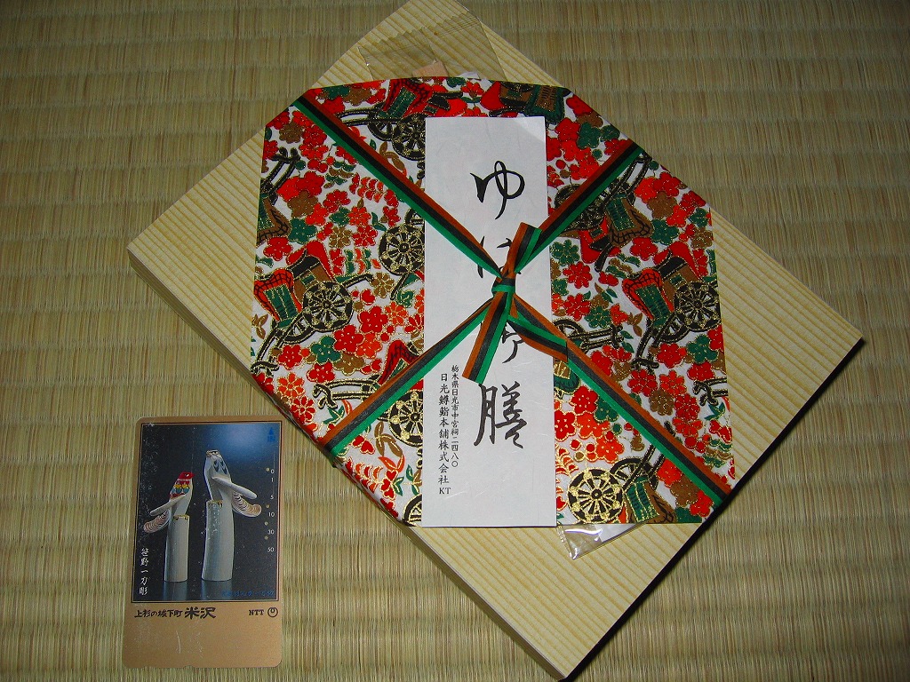 2004(平成16)年6月26日に購入した、東武日光駅弁の掛紙。上記の駅弁「ゆば御膳」の、2004(平成16)年6月時点での姿。掛紙の絵柄は変わらず、これに添える紙片に食品表示がなかった。中身は上記の2009年や2018年のものと異なり、湯波の混ぜ御飯にマス焼、玉子焼、昆布、インゲンとシイタケの煮物、湯波巻を添えていた。