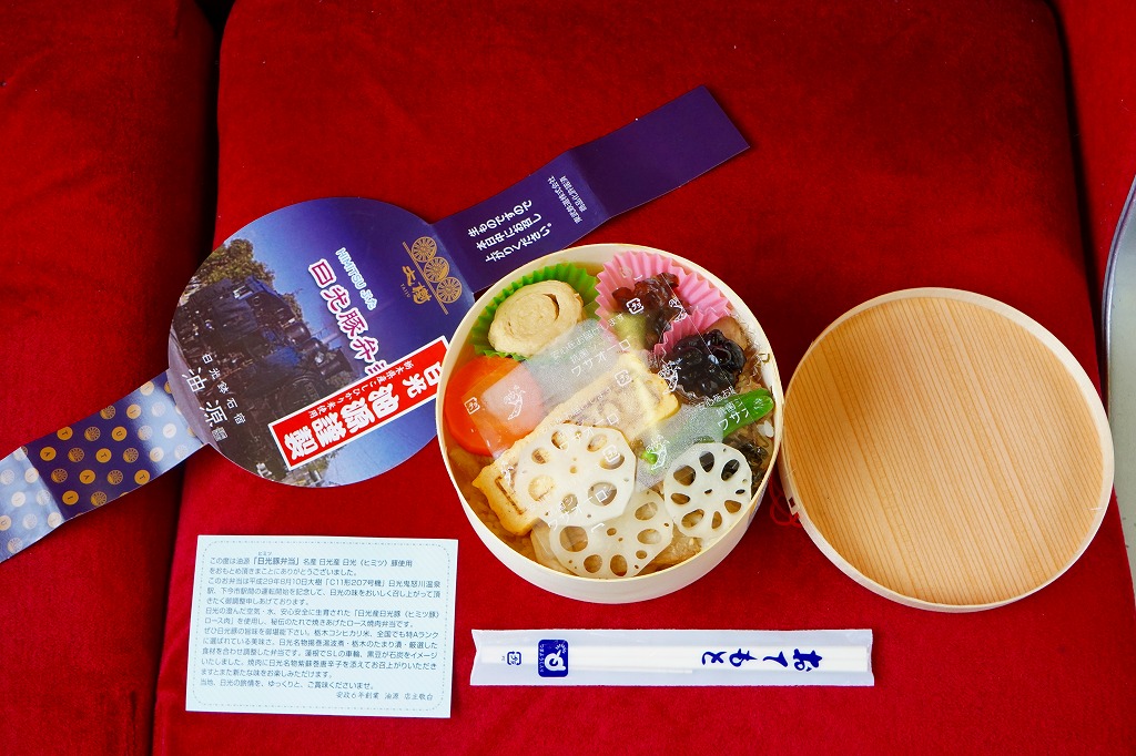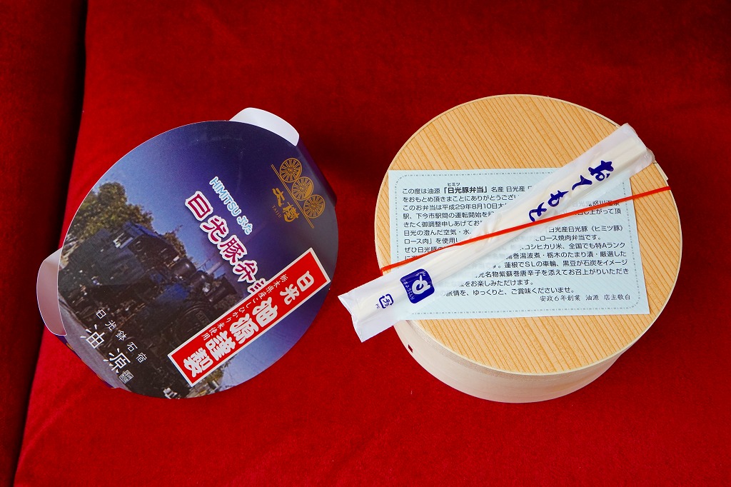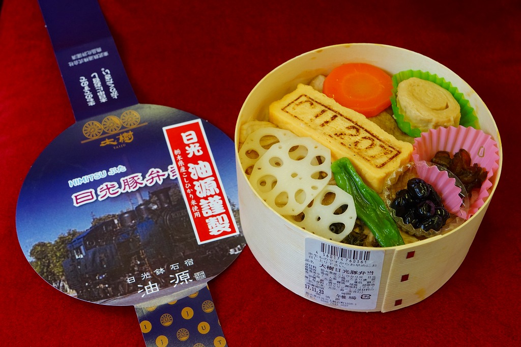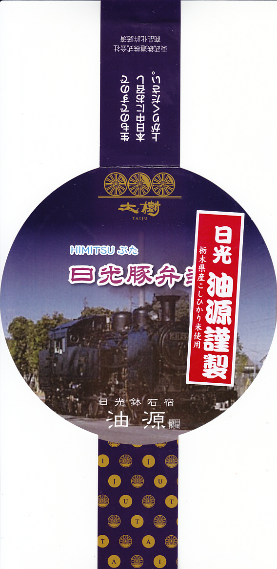 東武鉄道のSL列車「SL大樹」の運行開始に合わせて、2017(平成29)年8月に発売。6月に東京都内の東武百貨店池袋店で先行販売。丸い容器にかけた丸い掛紙には、SL大樹の写真やロゴマークが使われる。茶飯を淡色の豚焼肉で覆い、3枚のレンコン、蒸気機関車のナンバープレートの焼き印入り玉子焼、煮豆、湯波などでまた覆う。食べれば落ち着いた、副菜の多い豚焼肉丼。豚を二度も名乗る駅弁の名前と違い、見た目で豚肉が全然目立っていない。2020年までの販売か