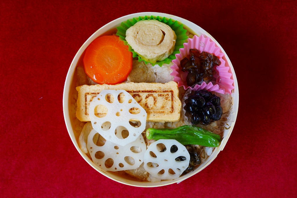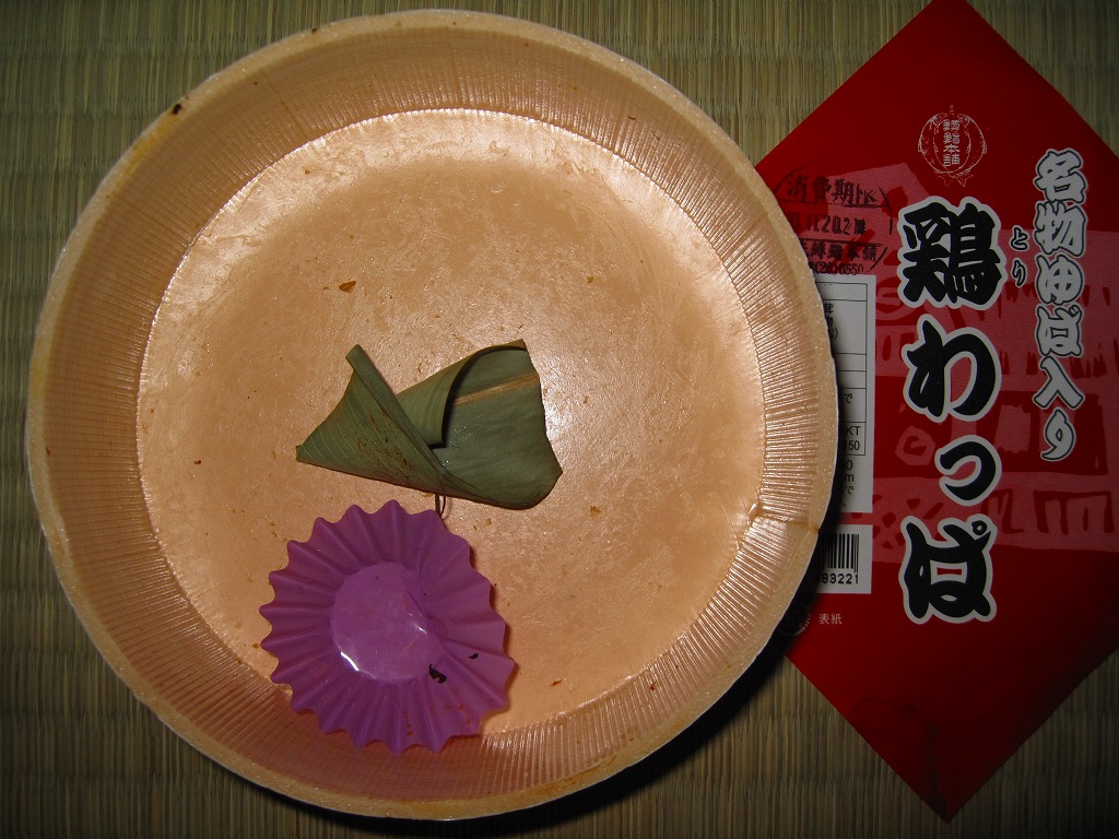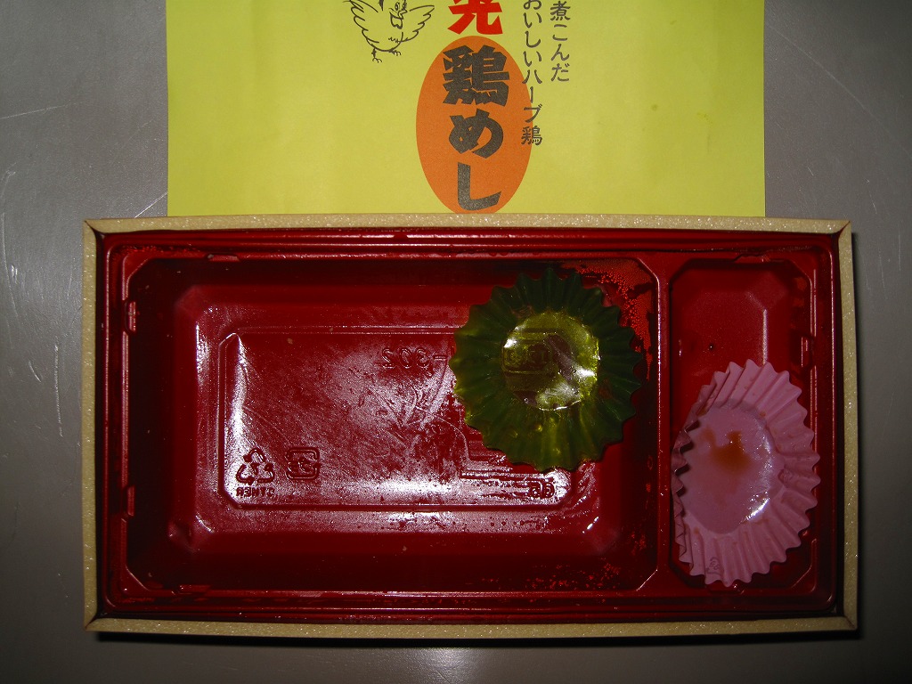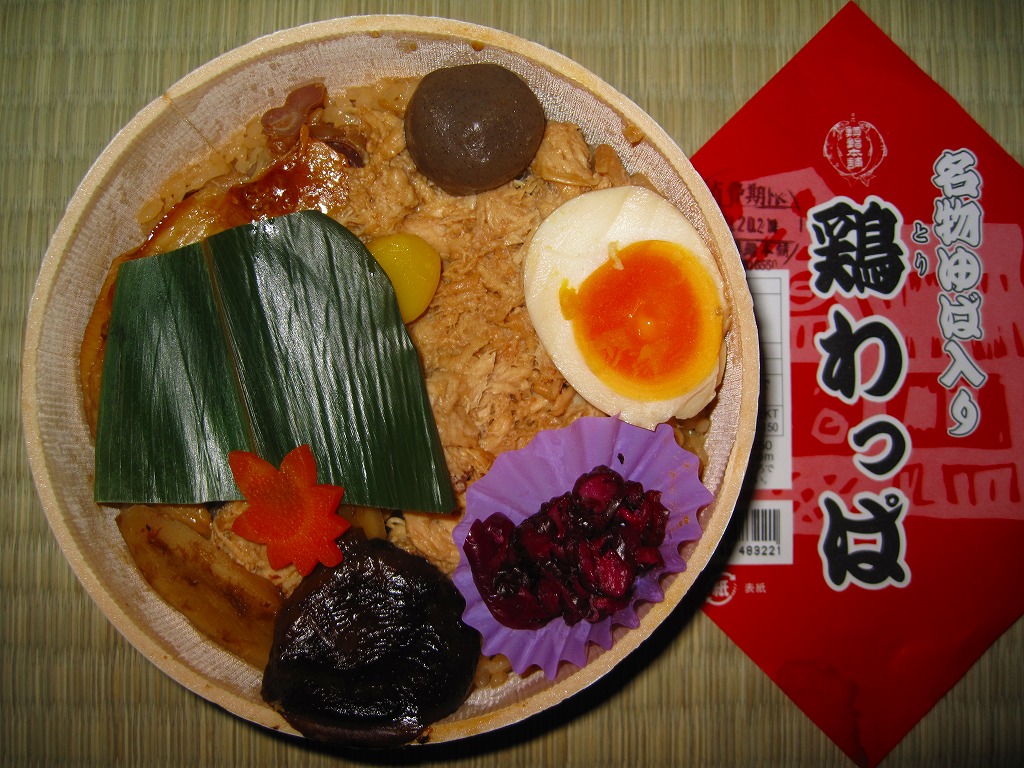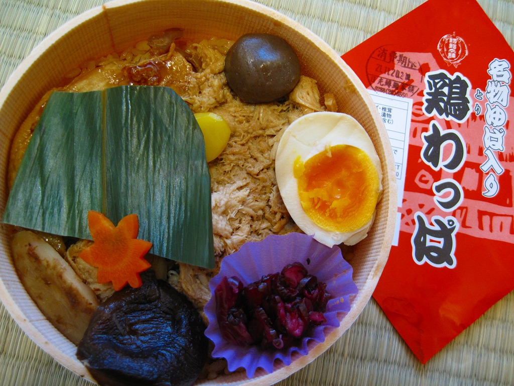 2007(平成19)年の秋頃までに発売か。2005(平成17)年の秋に発売した「軍鶏わっぱ」のリニューアル品だそうな。円形の容器に透明なふたをして、割りばしを置いて赤い掛紙をかけて、輪ゴムで十字にしばる。中身はおそらく鶏ガラスープで炊いた茶飯の上に、蒸し鶏ほぐしとゆばを敷き詰めて、煮玉子、手羽先、こんにゃく、ごぼう、シイタケ、クリ、柴漬けなどを載せるもの。