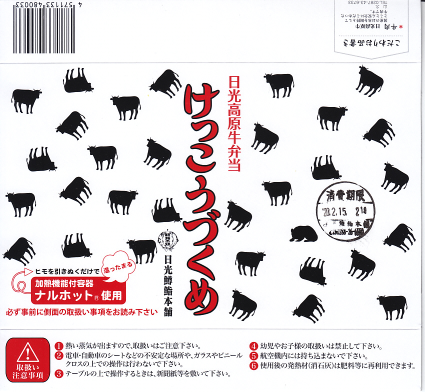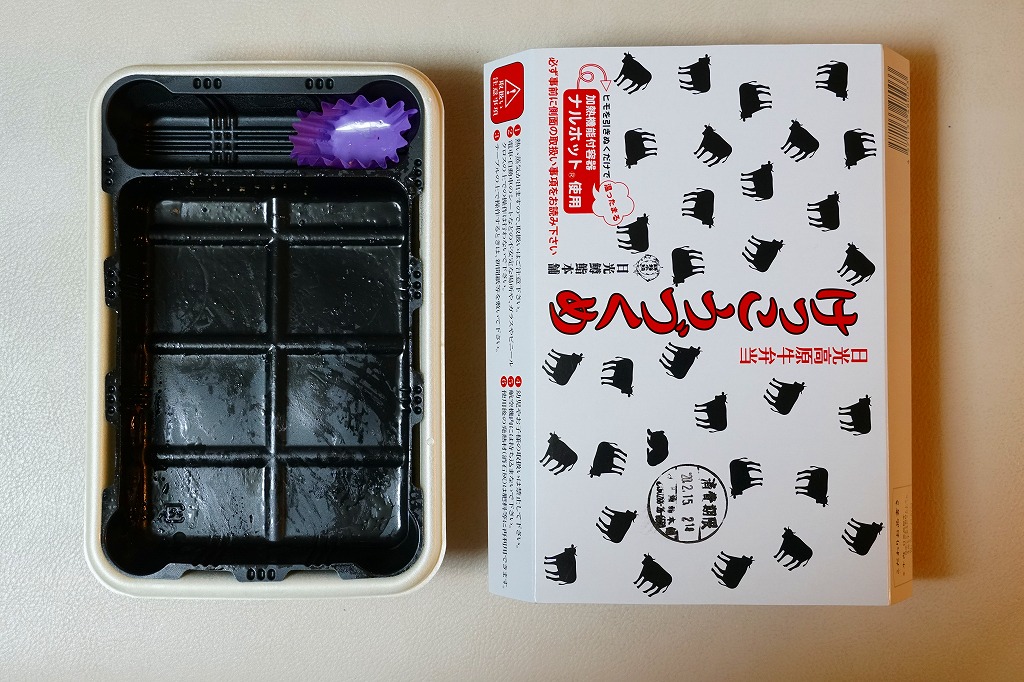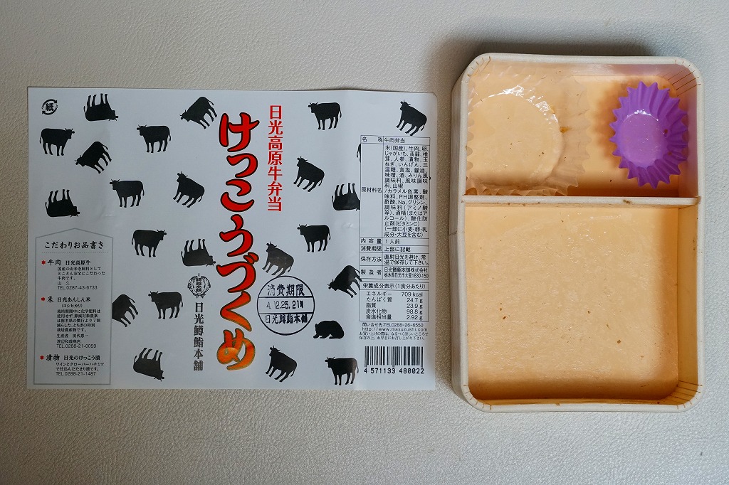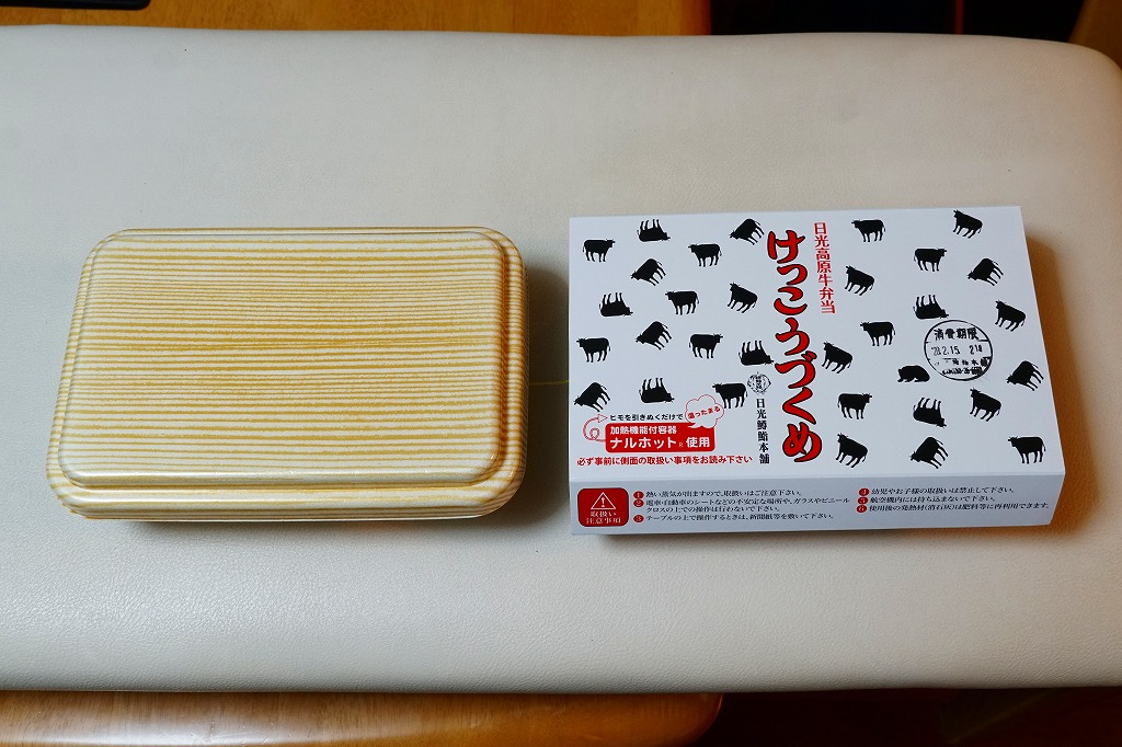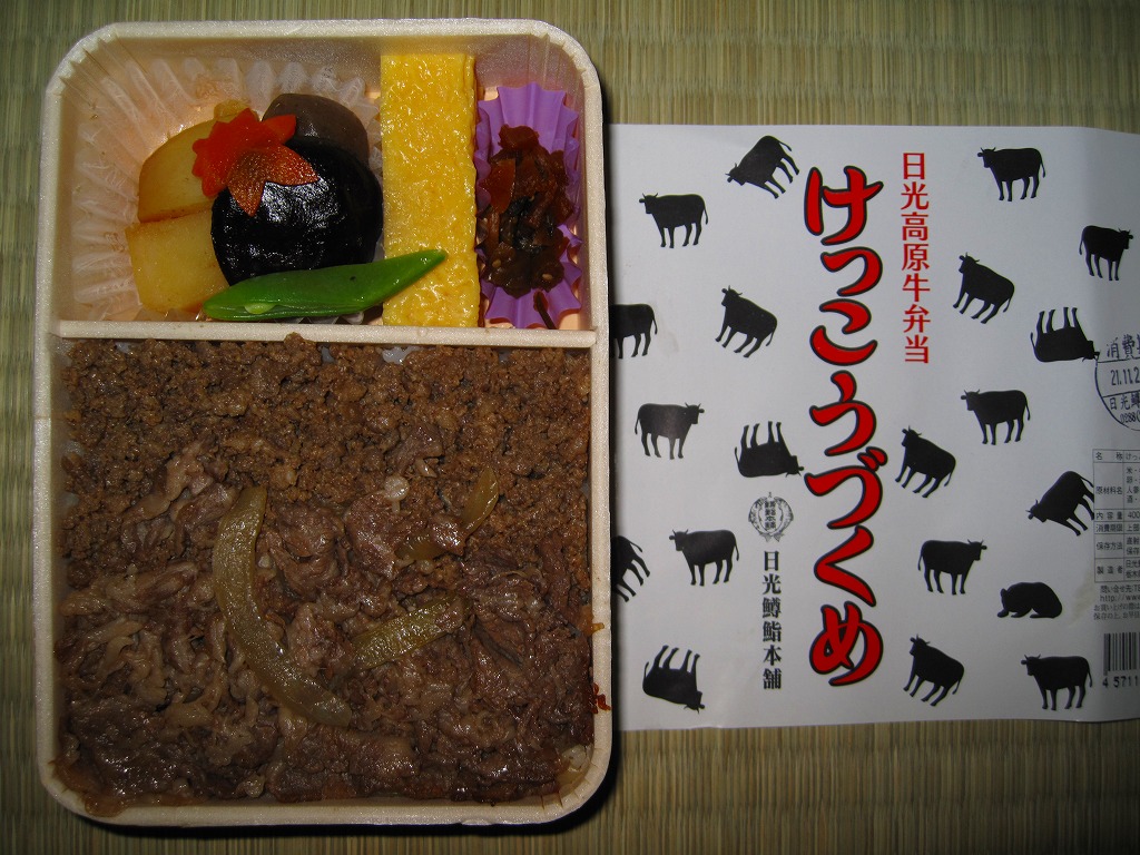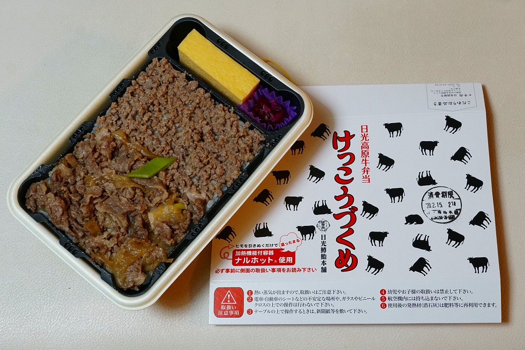 上記の駅弁「日光高原牛弁当けっこうづくめ」の、加熱機能付き容器版。スリーブの絵柄は通常版の掛紙と同じ。中身は通常版から煮物類が省略されており、牛そぼろと牛すき焼き肉で覆われた白御飯と、玉子焼と柴漬け。他の駅では通常版プラス200円が相場だと思う差額は、ここでは2020年当時で350円もあった。そのためか、加熱機能付き容器の牛肉駅弁では寂しく思うことが多い肉の分量が、ここでは確保されていた。この加熱機能付き容器版は2023年までの販売か。
