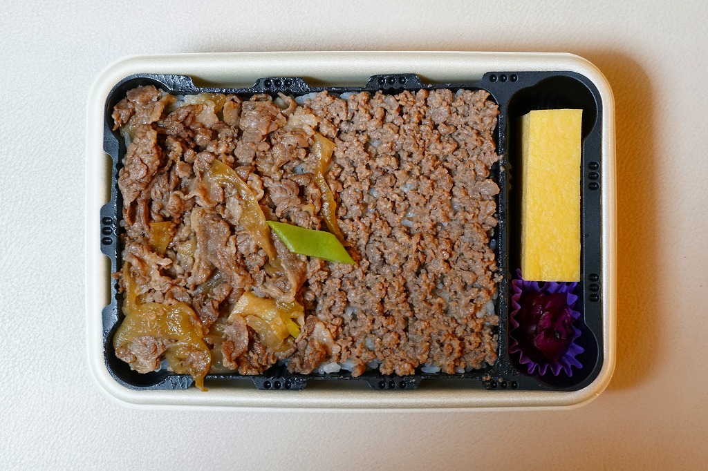 長方形の容器に透明なふたをして、割りばしを置いてから輪ゴムで留めて、商品名と牛のアイコンを印刷した掛紙を巻いてさらに輪ゴムで留める。中身は白御飯の上を牛そぼろと牛すきやき肉で覆い、玉子焼、ジャガイモやシイタケなどの煮物、漬物を添えるもの。