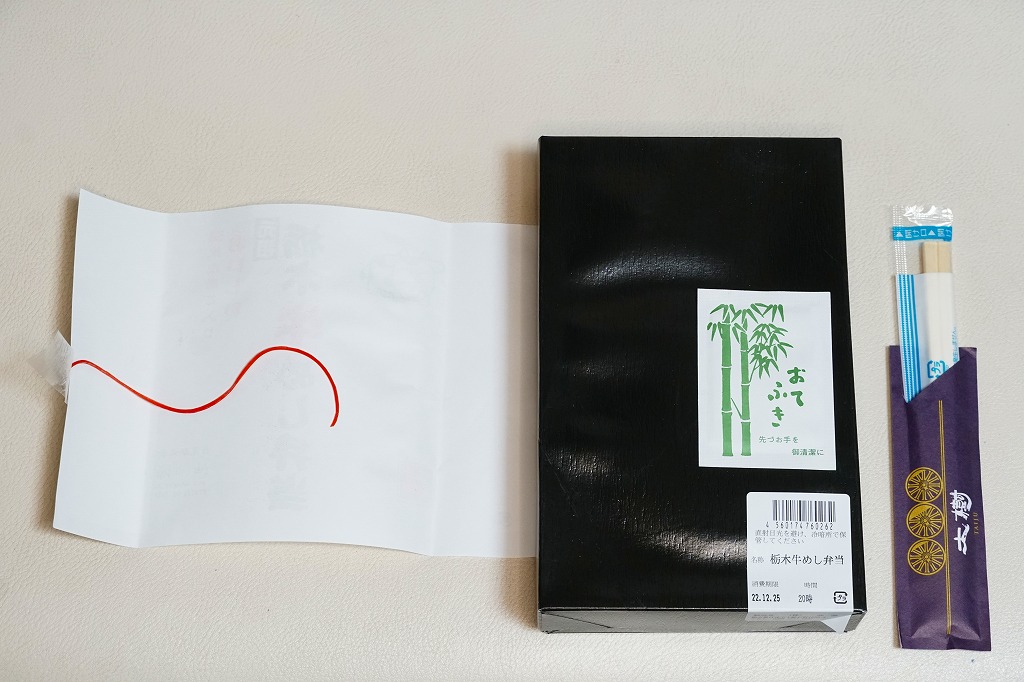 2007(平成19)年頃までに「栃木牛めし弁当」の名前で発売か。黒い木製風の長方形のボール紙製容器に、商品名を書いたシンプルな白い掛紙を巻く。白いプラ製トレーに入る中身は、コシヒカリの白御飯に、日光高原牛の赤身が真っ黒な牛焼肉を貼り、パプリカ、ししとう、ニンジン、タケノコ、かまぼこを貼り、温泉玉子とたまり漬を添えるもの。牛飯駅弁などとてもありふれた存在であるが、ここではシンプルながら他駅に似ない姿をしていた。価格は2010年時点で950円、2015年時点で「元祖栃木牛めし弁当」と名を少し変え1,000円、2022年時点で1,150円。